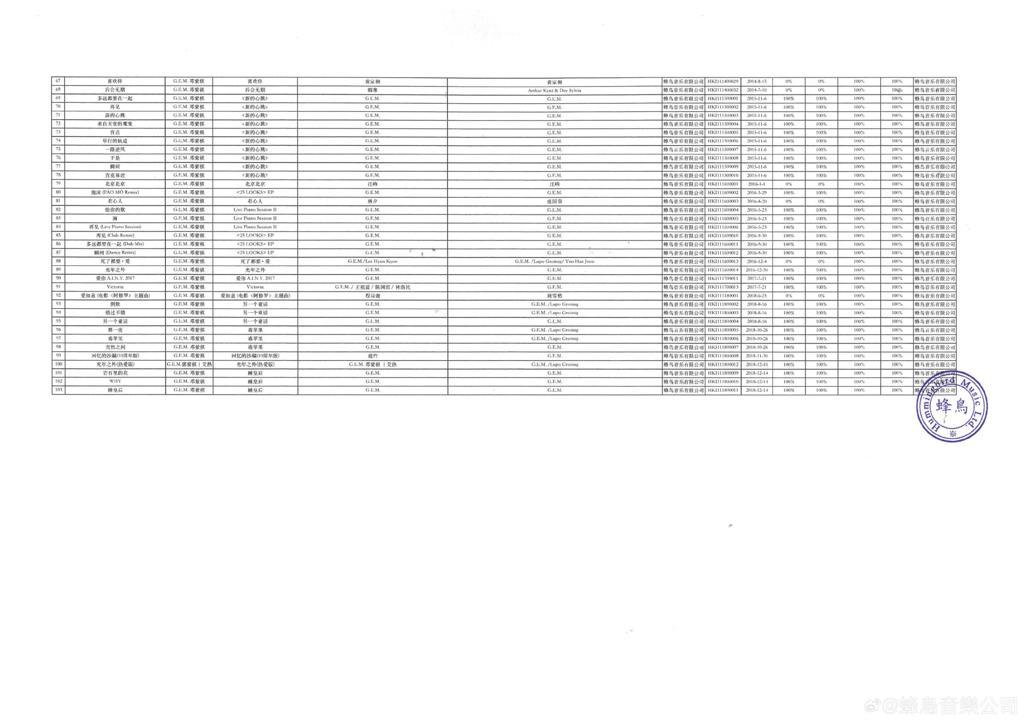 根據蜂鳥列出的歌曲名單,103首歌中有1首是G.E.M.跟其他歌手合唱,其餘102首的歌曲演唱歌手都是G.E.M.,另外僅有13首是她未有參與作曲作詞的部份,89首則是G.E.M.有份參與創作,包括《睡公主》、《A.I.N.Y.(愛你)》、《泡沫》、《光年之外》、《來自天堂的魔鬼》等等。聲明一出,網民洗版式鬧爆蜂鳥是吸血鬼。