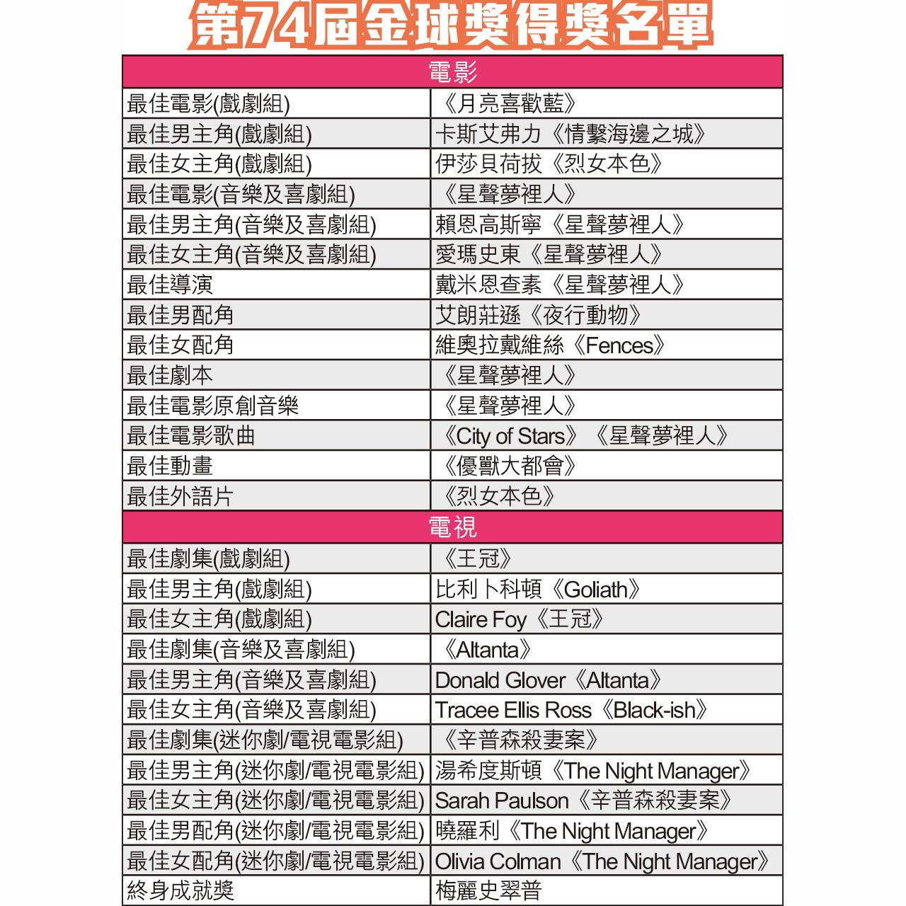 第74屆金球獎得獎名單
