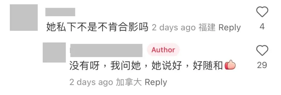 其他網民均大讚鍾嘉欣親民,又提及自己過往曾巧遇鍾嘉欣嘅經歷:「其他明星,無化妝肯定唔理人,嘉欣BB仲問番你介唔介意,太羨慕了」、「之前偶遇過她素顏帶小孩,問她能不能拍也很nice說可以,感覺沒傳說中脾氣那麼差啊」等等,又指明白藝人有時唔想影相都好正常:「偶像都係人姐,都有不想被打擾嘅時候,我覺得拒絕都好正常姐」、「一看就是黑子造謠的,遇上不方便合照的時候,就說是耍大牌不合照」等等。
