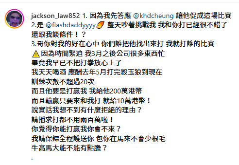鍾培生日前在社交平台公開與四海的對話,內容大致談及希望拳賽可於315日在大馬舉行,到時會作線上直播,並由鍾培生安排拳證、裁判,四海初步答應鍾培生可以參與。至於Flashdaddy方面,就要求一定在香港舉行,更拍片指雙方都是香港人,沒有理由到大馬舉行比賽,更斥對方不減磅,使自己的體重佔一定的優勢,揚言這場拳賽一定要在香港舉行沙會參與。