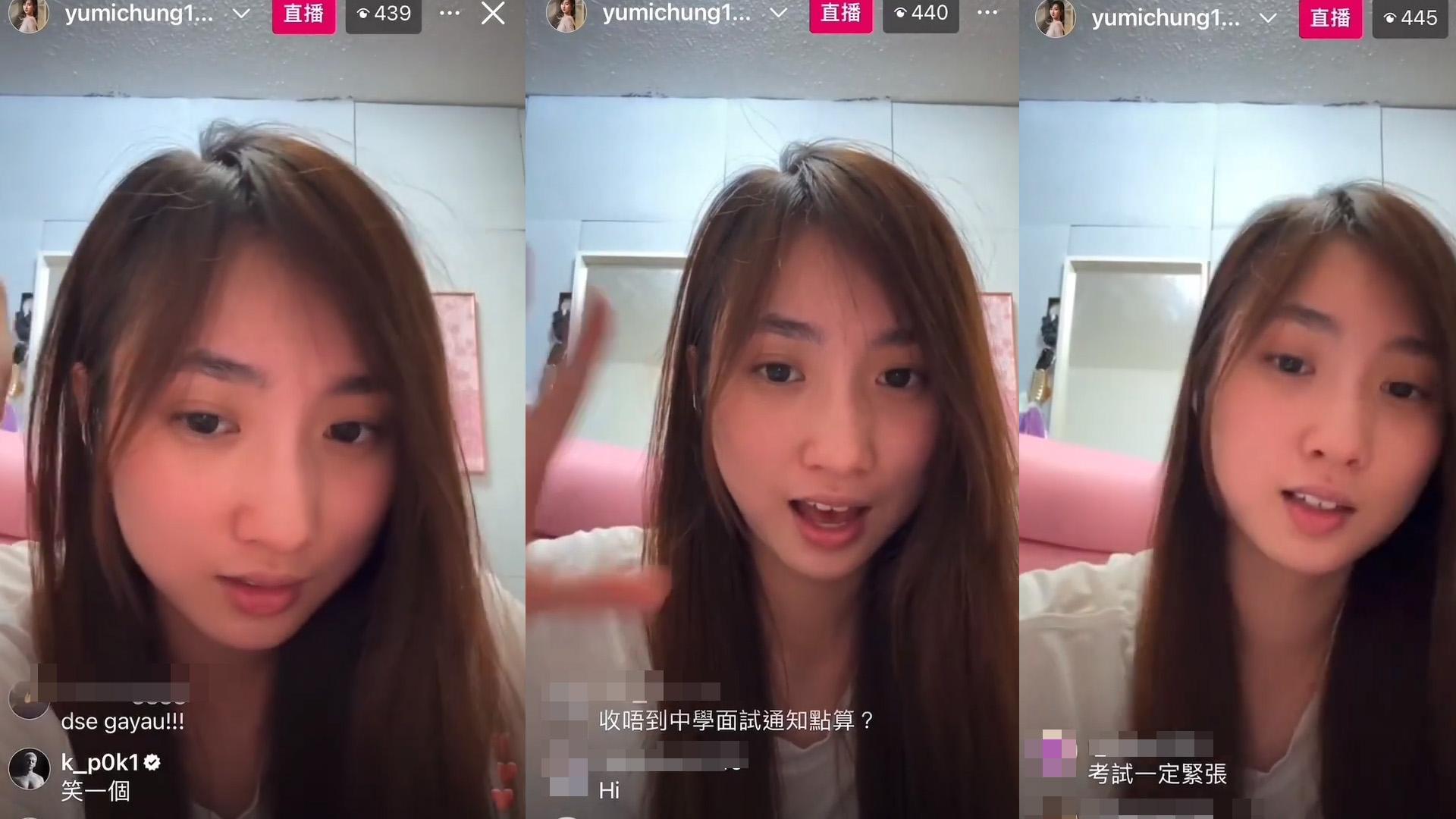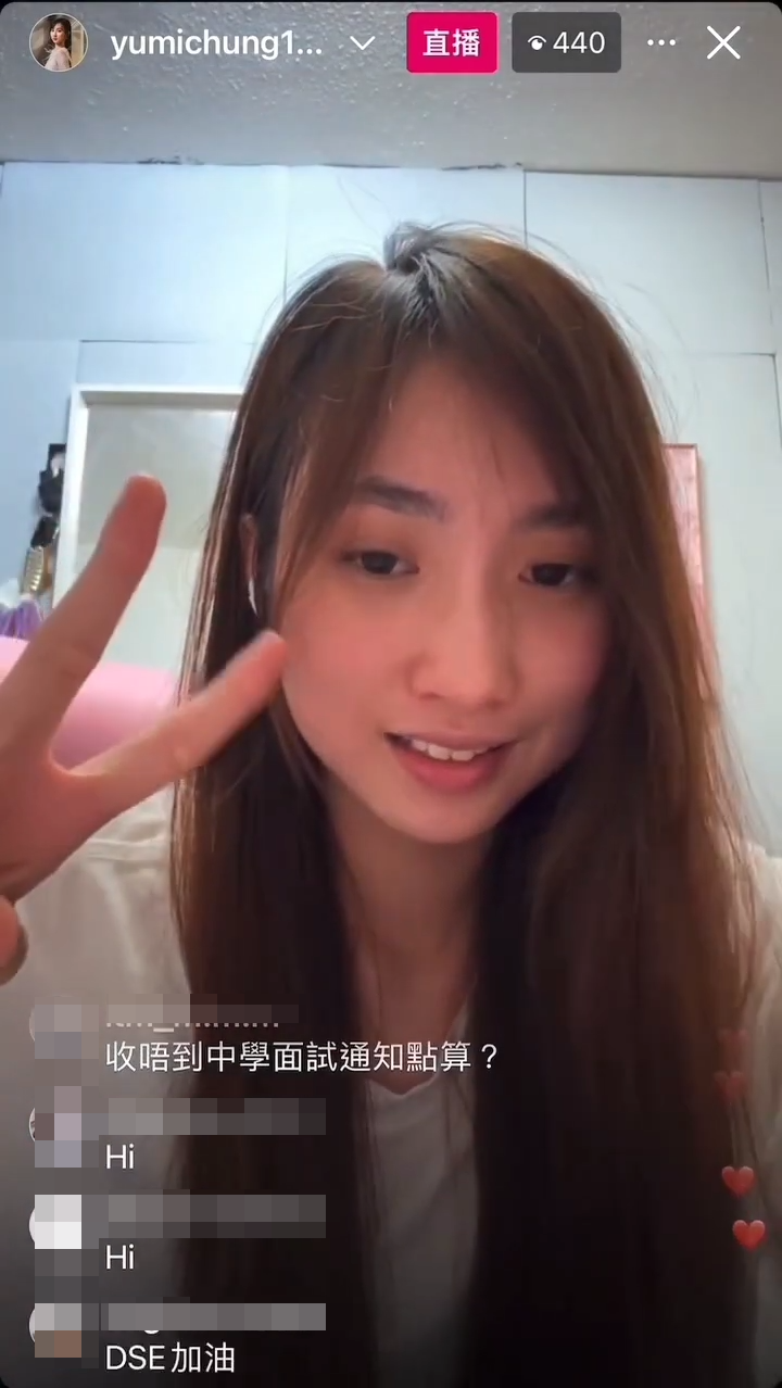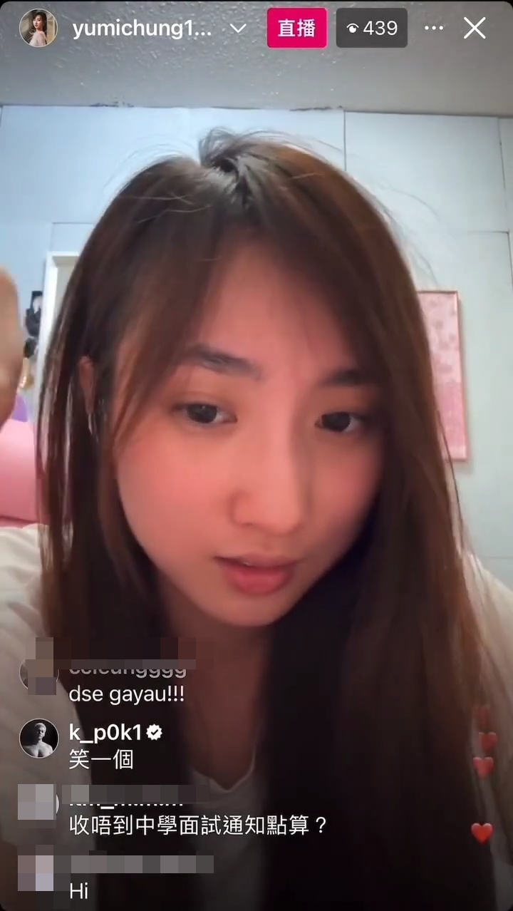 Yumi在直播中表示,擔心大家忘記了她,於是趁休息期間開直播跟大家見下面。她在直播中透露不會到海外升學,希望在港升讀大學並主修BBA課程。她又提到因為溫書期間不停吃零食,搞到額頭生了不少暗瘡,期間更一度透露自己不用考中文。不少網民追問Yumi為何不用考中文,但她未有回應,有網民估計本身是中菲混血兒的她,應該是以非華語學生轉考GCE/IGCSE。
