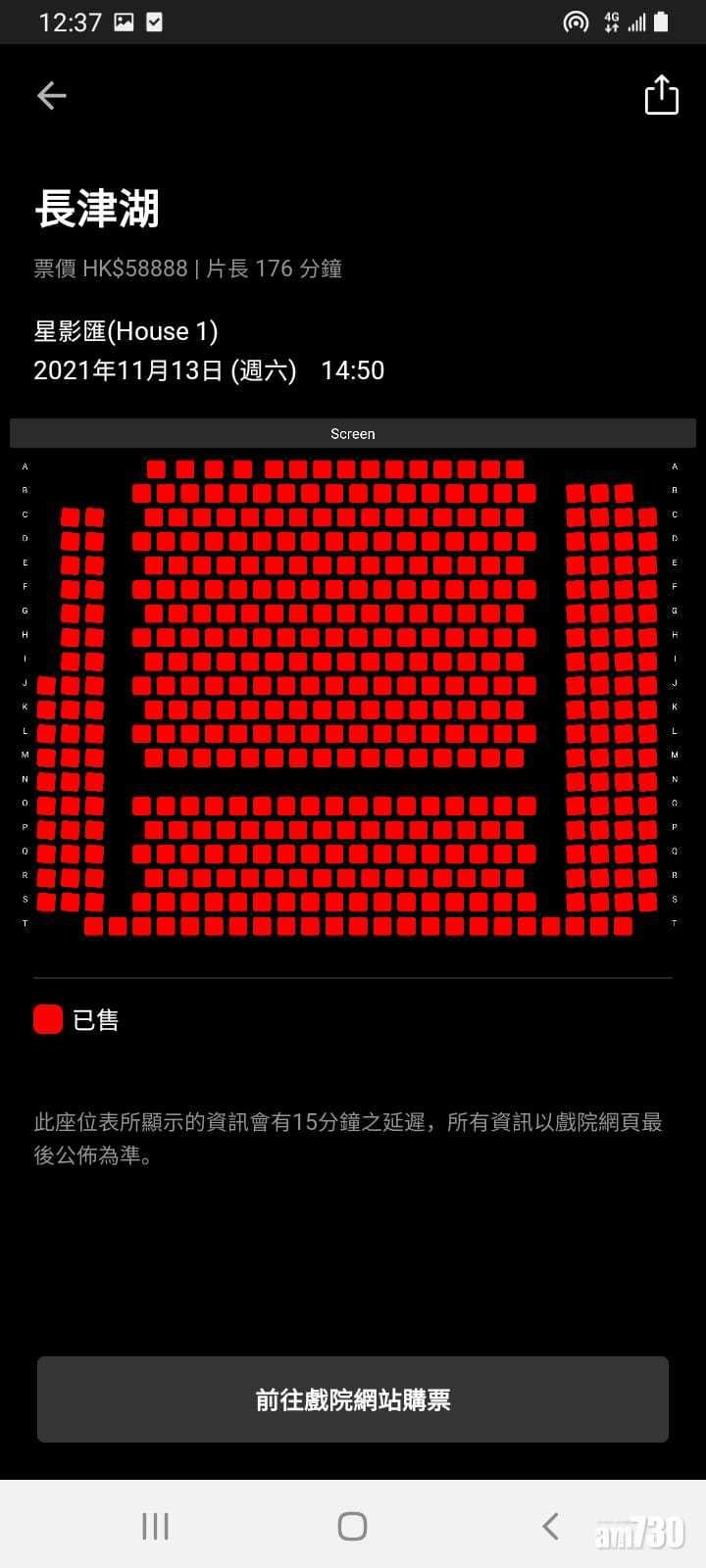 有網民留意到《長津湖》的門票,在多間戲院都賣到滿堂紅,其中以周六下午3時左右的場次,反應最熱烈,位於九展和銅鑼灣的Cinema City,以及奧海城的嘉禾,在差不多時段更連開2至5個影院。另有網民發現,周六下午2時50分於星影匯播出的場次,網上顯示票價為$58,888,估計是包場價錢。