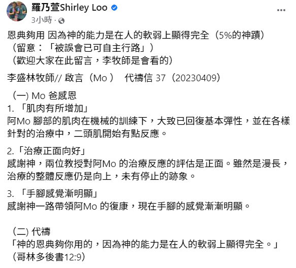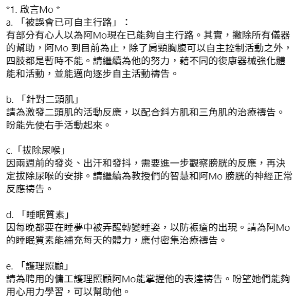 另外,他提到阿Mo因兩週前的發炎、出汗和發抖,所以仍未能拔除尿喉,並透露為防止兒子有防裖瘡而須轉睡姿,令他的睡眠質素欠佳。他又安慰患有不治之症的朋友,稱「醫生都是說95%是沒有甚麼辦法的了。但那5%在神的恩典和大能中,超越了醫學的統計,神蹟地渡過難關,當然醫護的努力也是不可缺少的。」亦同時分享作為照顧者的感受,「照顧阿Mo 的時候,我們常常提醒自己,我們就是他。」