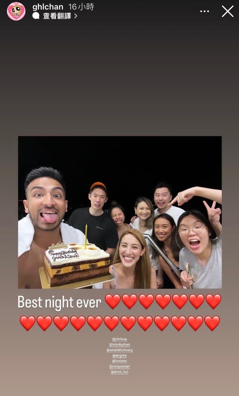 有指Grace其實早在4月已透露弟弟將與太太移民加拿大,並非傳聞中的不堪壓力。而懶理傳聞的Grace ,昨晚在於IG 限時動態繼續分享姊弟的慶生合照,見她非常珍惜與弟弟的相處時光,並寫道:「Best night ever (有史以來最好一夜)」,相信這個亦是Derek 移民前最後一個與家姐孖住慶祝的生日。