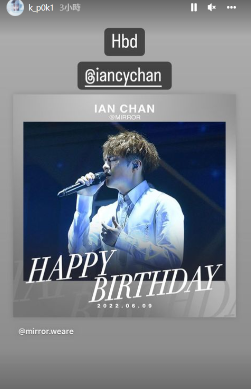 Ian由昨晚開始分享好友及同事為他慶祝的照片,其中一張有他與另外兩位女同事的合照,留言說︰「願望要用力許才會成真,幫大家許埋一份。」Ian的好兄弟江𤒹生(AK)搶先留言:「聽日先生日,咁早衝出嚟,我係唔會講生日快樂。」Tiger亦留言說︰「咁靠晒你啦大佬!」今日他則上載一張童年肥仔照並寫道︰「Happy birthday kiddo!代依位小朋友多謝大家嘅祝福同愛,感恩!」而MIRROR成員亦逐一在IG限時動態送上祝福,包括遠在美國的姜濤。
