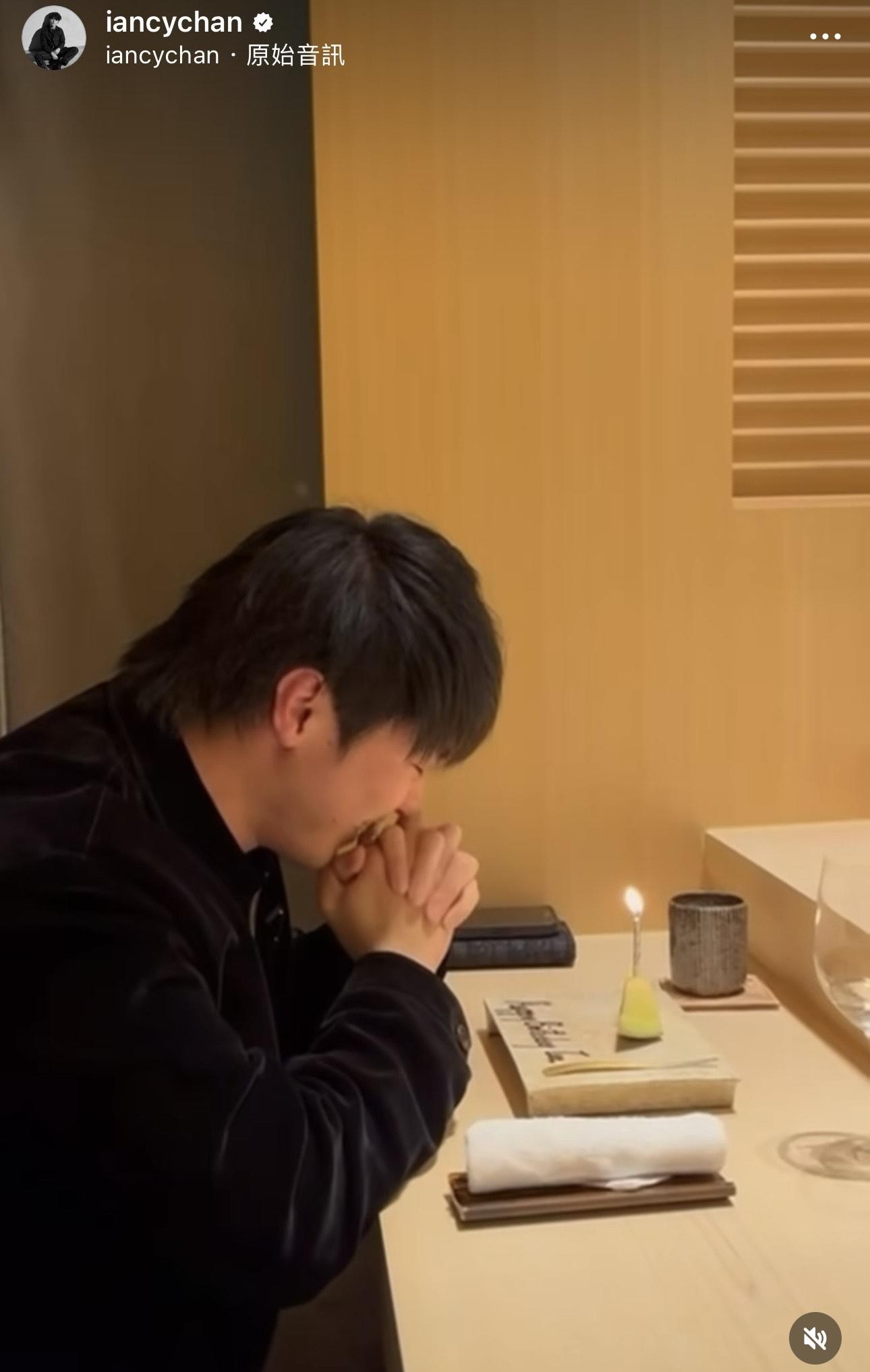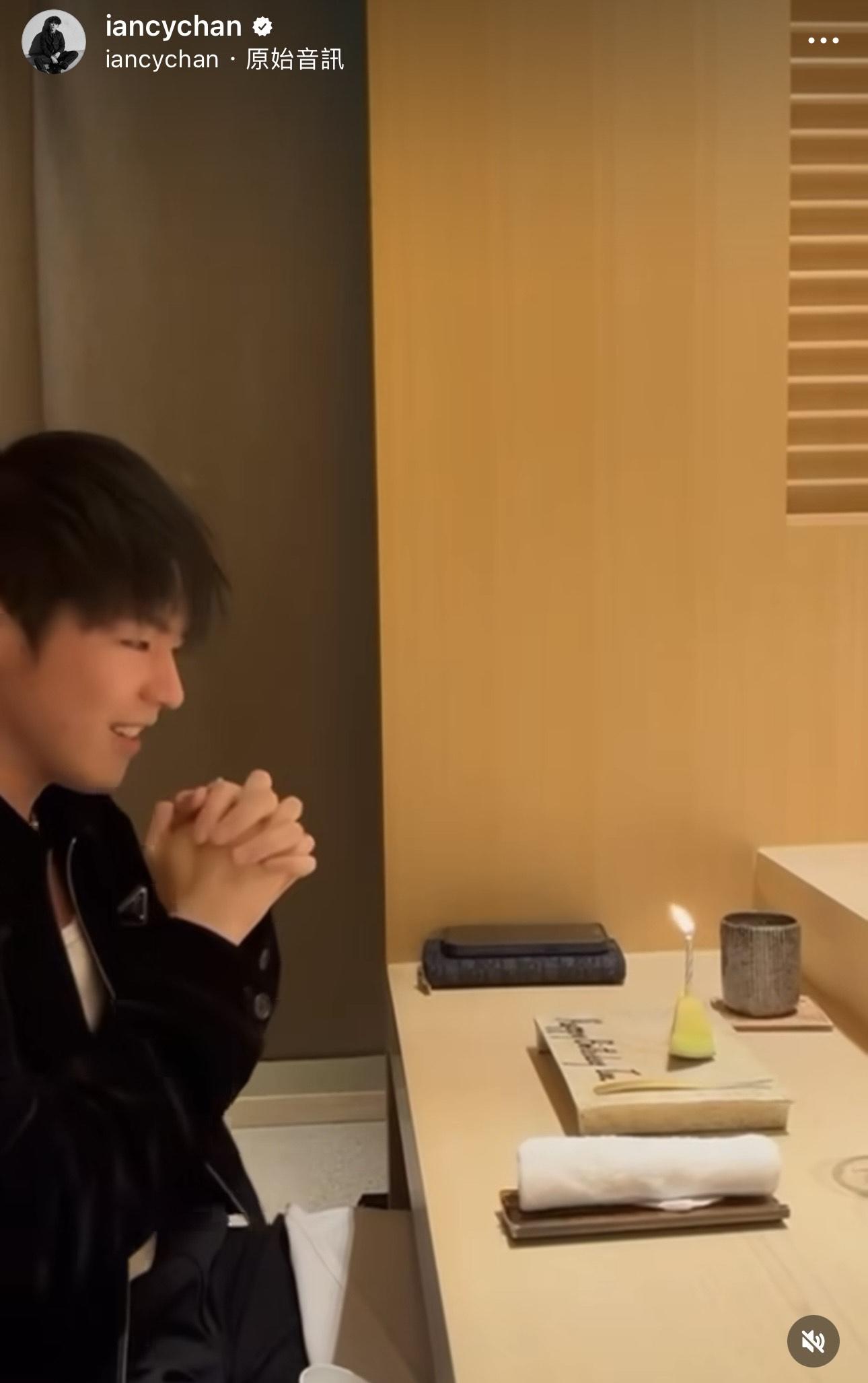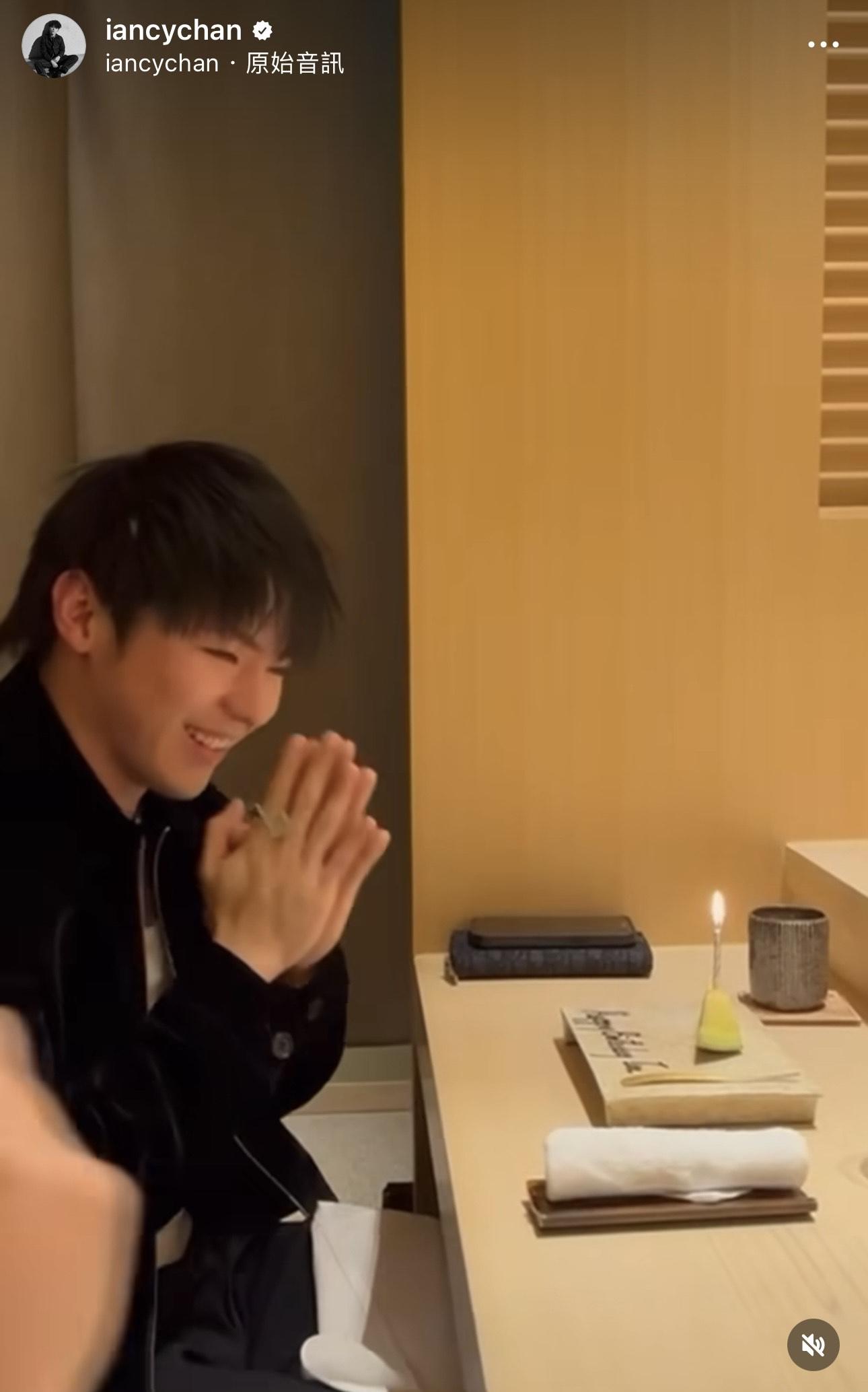 昨晚(13日)Ian便在社交網貼出當天慶生的片段,原來他是與AP潘宇謙及另一友人食飯,並寫道:「社恐現場」,片中見他如訪問中所說,起初店員捧蛋糕出來,Ian 以為是為他慶祝,原來是隔離的客人,Ian既怕羞又緊張說道:「嚇死我呀﹗」未幾,店員再捧出蛋糕,今次真係到Ian ,Ian 表情尷尬,但亦有開心許願,友人則在旁謂:「每人一張飛。」而潘宇謙留言笑指:「下次會唱『恭祝你福壽與天齊~』」。