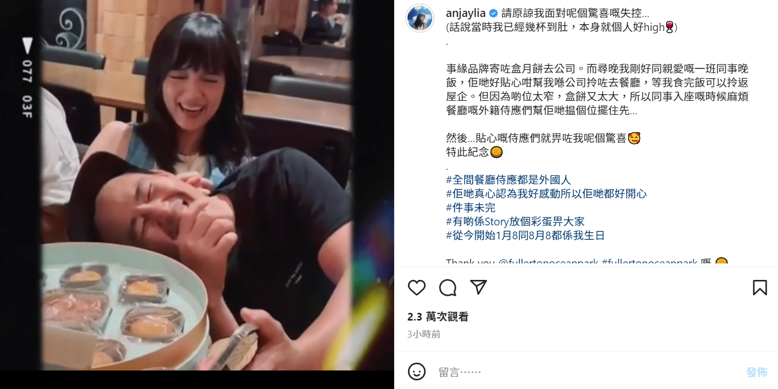 由於陳嘉寶老公也同時叫了甜品,餐廳的侍應就非常細心的特意送上另一款甜品,碟邊用朱古力寫了「Happy Birthday」及點上蠟燭,令眾人又笑過不停,她寫道︰「貼心嘅侍應們就畀咗我呢個驚喜,特此紀念。#全間餐廳侍應都是外國人#佢哋真心認為我好感動所以佢哋都好開心#從今開始1月8同8月8都係我生日」