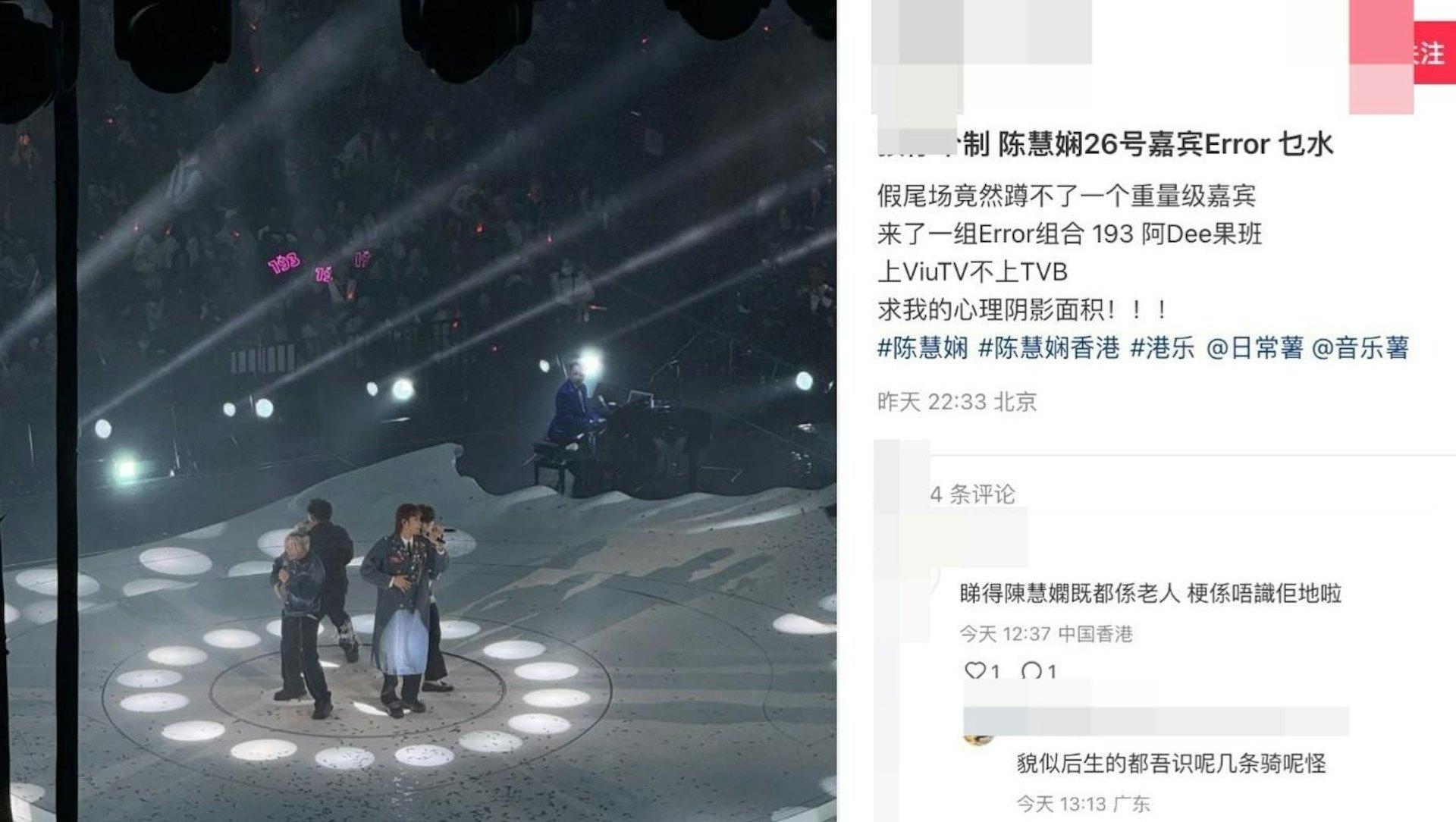 然而,陳慧嫻有來自不少內地的fans不熟悉ERROR,亦有入場的網民對於過去幾天的嘉賓都是一哥一姐級數,如今變成ERROR,落差太大感到失敗。於是他們在小紅書不停大吐苦水,留言除了問「ERROR乜水」、「紅館現場疑似有觀眾大喊『收皮』。」、「聽她講出嚟仲唔知係乜水」、「慧嫻姨姨你請埋D咩嘉賓啊!」