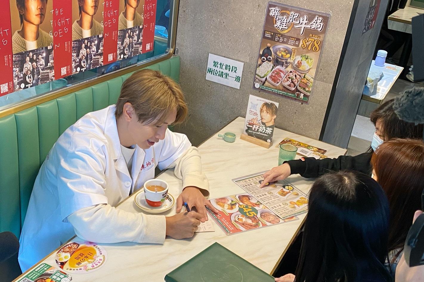 陳柏宇(Jason)今日到茶餐廳為全新專輯《The Fight Goes On》宣傳,並以一身侍應打扮出現,為食客落單、傾偈,用實際行動為香港忙碌的都市人打氣與抒壓。有不少粉絲聞風而至,Jason落單送餐之後更索性坐低,與粉絲們開心聊天。