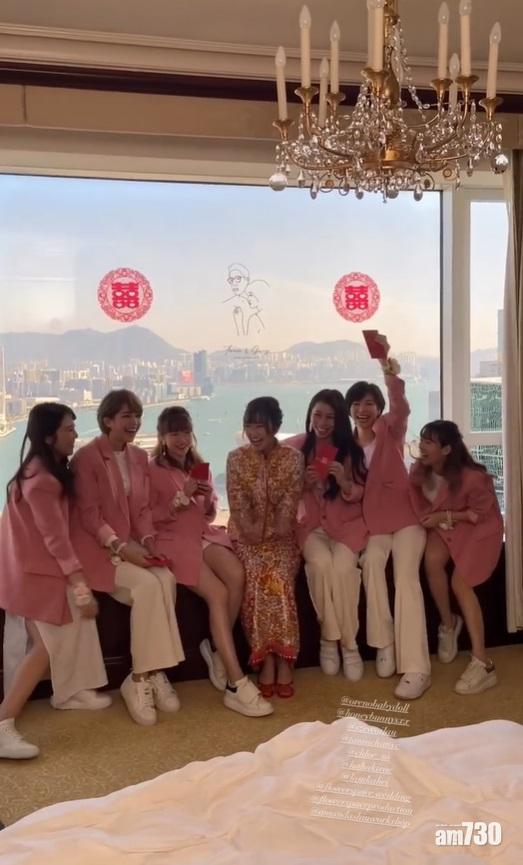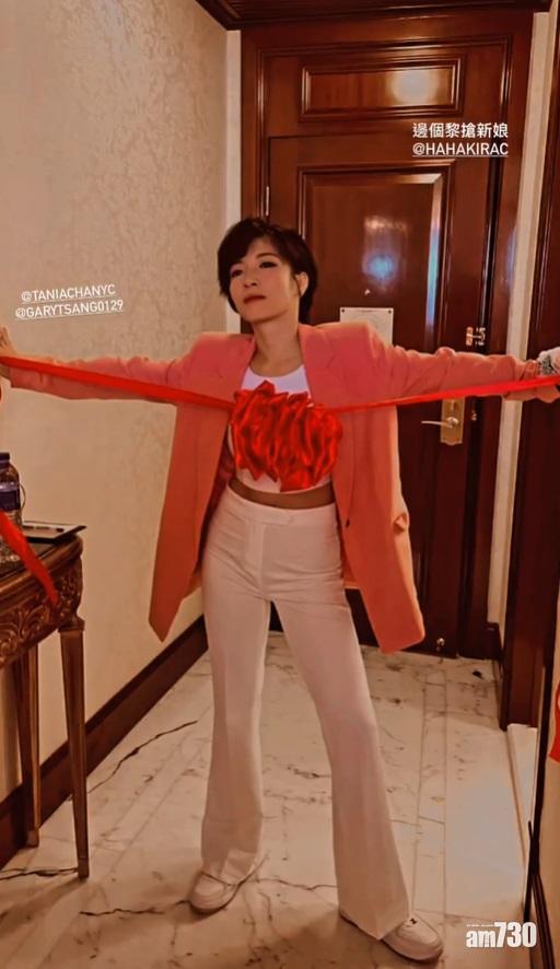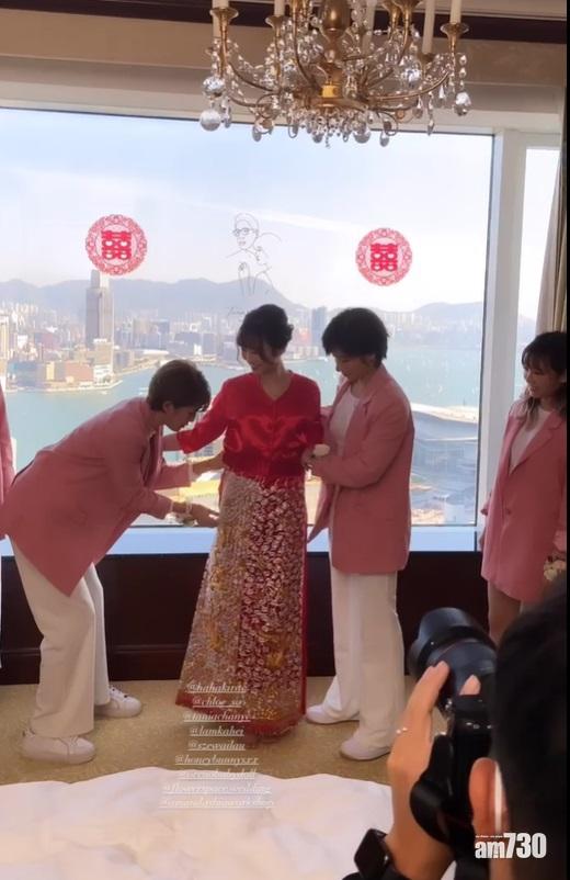 前女子組合As One成員陳苑澄(Tania)今日下嫁酒行太子爺Gary,昔日戰友陳葦璇、蘇皓兒齊齊擔任姊妹,眾人更一反傳統以粉色西裝上陣,非常有型。陳葦璇與蘇皓兒為Tania穿上裙褂,Gary宣讀「愛的宣言」的時候,Tania一度感動落淚。其後一眾姊妹換上酒紅色姊妹裙到戶外搶花球,蘇皓兒成功接到並與新娘子合照。
