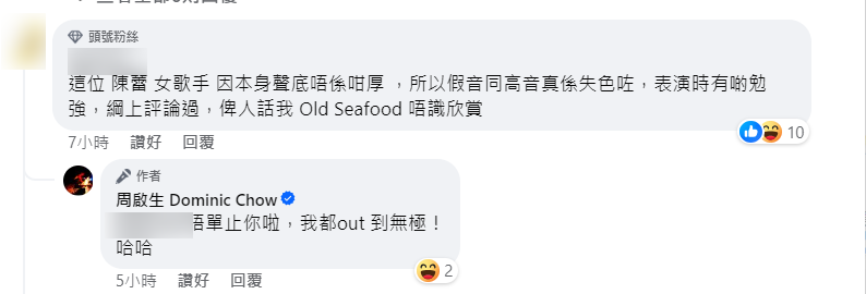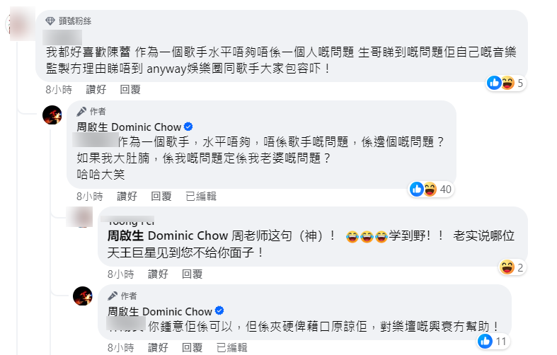 周啟生表示開騷本身是可喜可賀的事,他「冇心將佢攞嚟評頭品」,於是問網民如何評價。有人留言表示曾在網上評論過陳蕾「本身聲底唔係咁厚,所以假音同高音真係失色」,但遭人批評他不懂欣賞,周啟生就回應表示自己「out到無極」亦有人指陳蕾是當今比較好的歌手,他就回應說︰「你鍾意佢係可以,但係夾硬俾藉口原諒佢,對樂壇嘅興衰冇幫助!」
