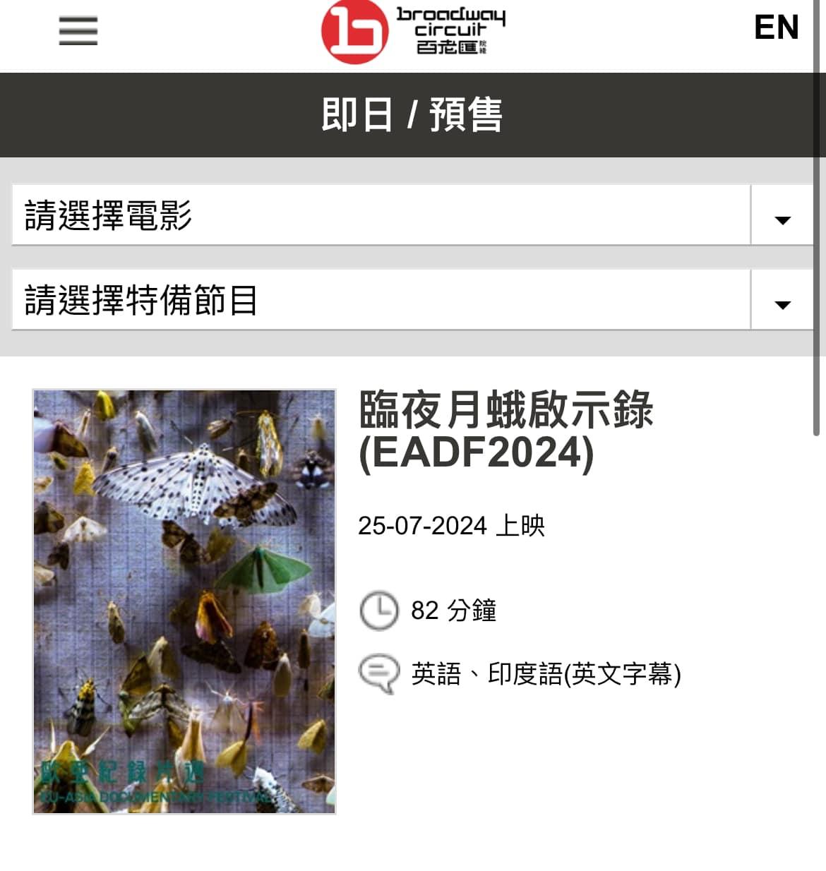 從網站見到電影《臨夜月蛾啟示錄》將於7月25日及8月3日有場次,而此片更獲「辛丹斯電影節世界紀錄片評審團特別獎」、「塞薩洛尼基國際紀錄片電影節WWF獎」。語言是英語或印度話。網站列出影片的內容,其實整部作品都是圍繞一種飛蛾。