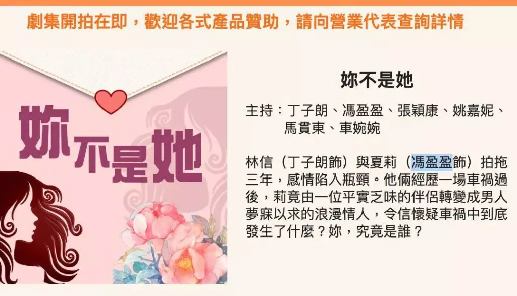 時裝愛情喜劇《妳不是她》劇情主要講述丁子朗及馮盈盈拍拖三年,不過二人嘅感情陷入瓶頸。佢哋喺經歷一場車禍後,馮盈盈由一個平實乏味嘅情人變成一個男人夢寐以求嘅情人,搞到丁子朗都懷疑車禍到底發生咗啲咩事。