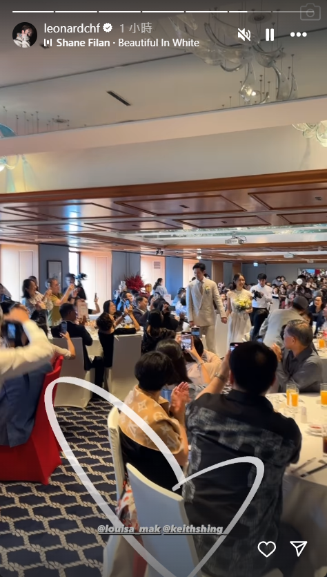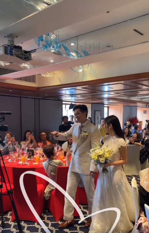 麥明詩好友鄭衍峰擔任今次婚宴的主持,從他的IG見到今午一對新人在室外設宴,麥明詩身穿一襲設計簡約的婚紗,與老公盛勁為手拖手步入會場,接受一眾親友的祝賀,而回禮禮物則是麥芽糖及餅乾,非常有意思。