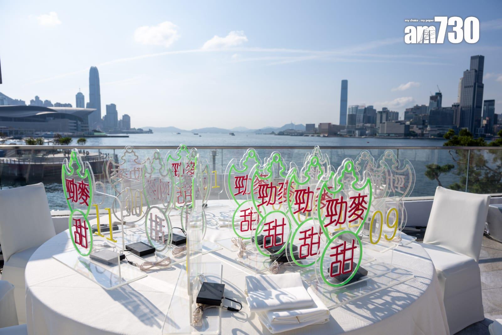 麥明詩與盛勁為的婚禮大搞3場,昨日(23日)在元朗舉行盆菜婚宴,更請到李龍基和林景程表演助慶。今日移師到銅鑼灣吉列島遊艇會舉行,會場大玩港式情懷,見到有懷舊小食攤檔,掛滿了80、90後的童年零食及玩物,當中包括西瓜波和紅白足球等。