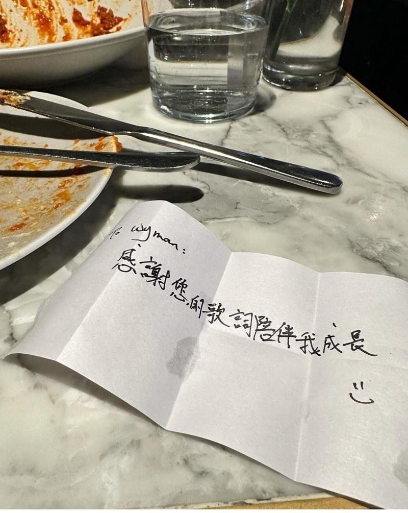 Wyman表示埋單時,一個白人女侍應俾咗一張紙仔佢,話廚師吩咐佢傳遞。Wyman寫道:「我打開一看……那張皺皺的,『油淋淋』的小紙片,分明是在廚房裡,匆忙之間唯一找到的『便條』,反而令整件事情更有溫度(和濕度)。」Wyman重點提到:「常言以愛換愛,今天我換到了,心頭一暖。謝謝。」原來,廚師給他的小紙片寫著:「感謝您的歌詞陪伴我成長。」少少數字,超暖心。