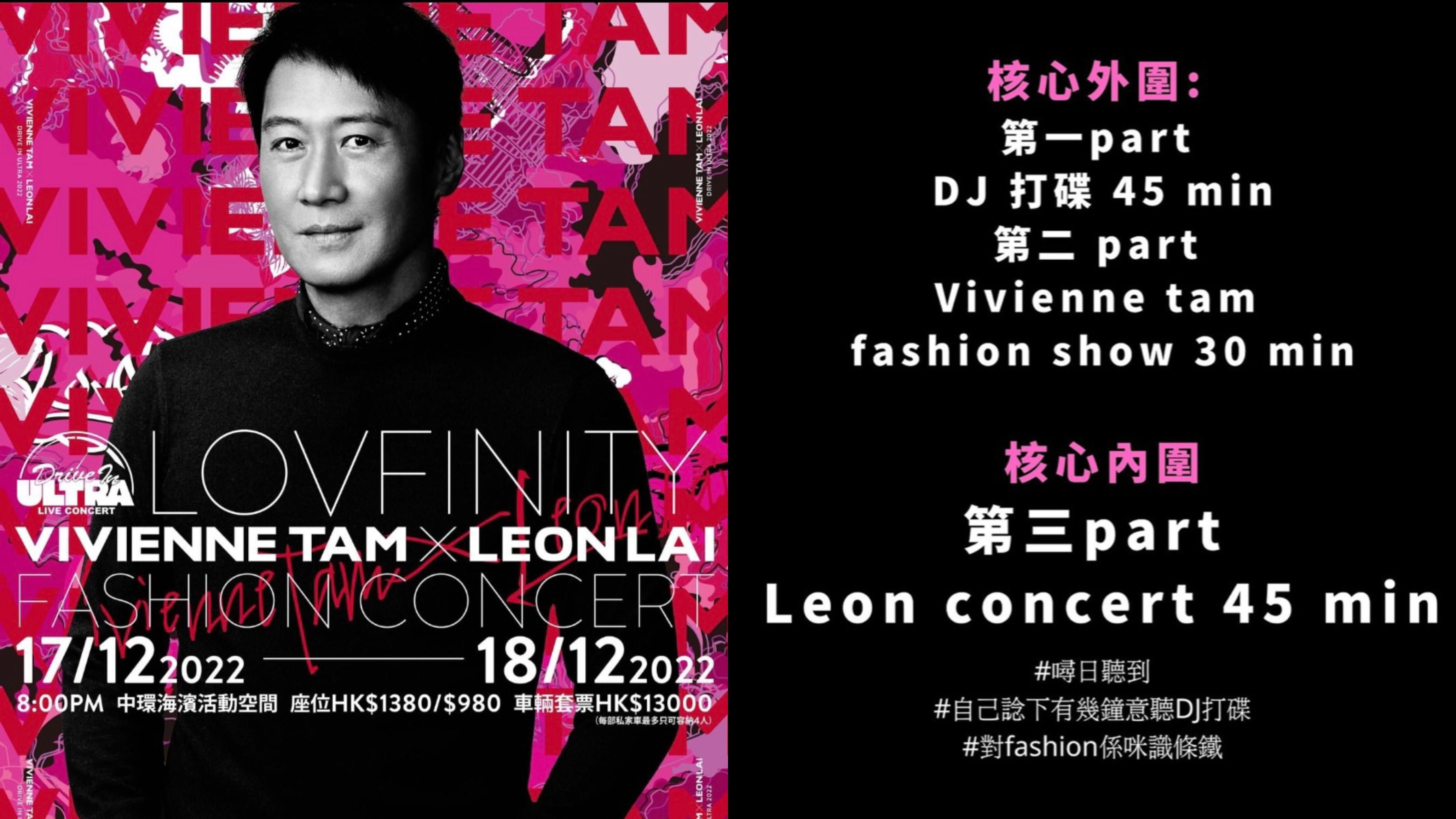 樂壇天王黎明早前宣布將於121718日假中環海濱舉行兩場Drive In Ultra: LOVFINITY Vivienne Tam x Leon Lai Fashion Concert》戶外演唱會,個唱更結合名師Vivienne Tam的時裝和音樂會,票價分別為座位$1380$980$13000(車輛套票,每部私家車最多只可容納4人)。
