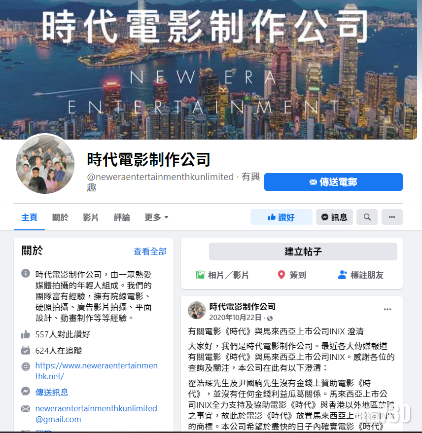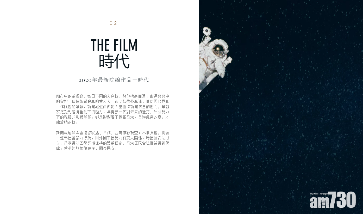 《時代》的官網內容大談電影創作理念,稱反送中運動不斷發生暴力行為,「令人痛心疾首」,又指運動「涉及到香港獨立運動,亦是背離《中華人民共和國香港特別行政區基本法》與『一國兩制』原則的違法行為。本公司留意到社會發生好多不公義的事情,市民大眾對香港警察無理的抹黑、不真實的報道記錄等等」,希望透過電影「警惕新一代」。