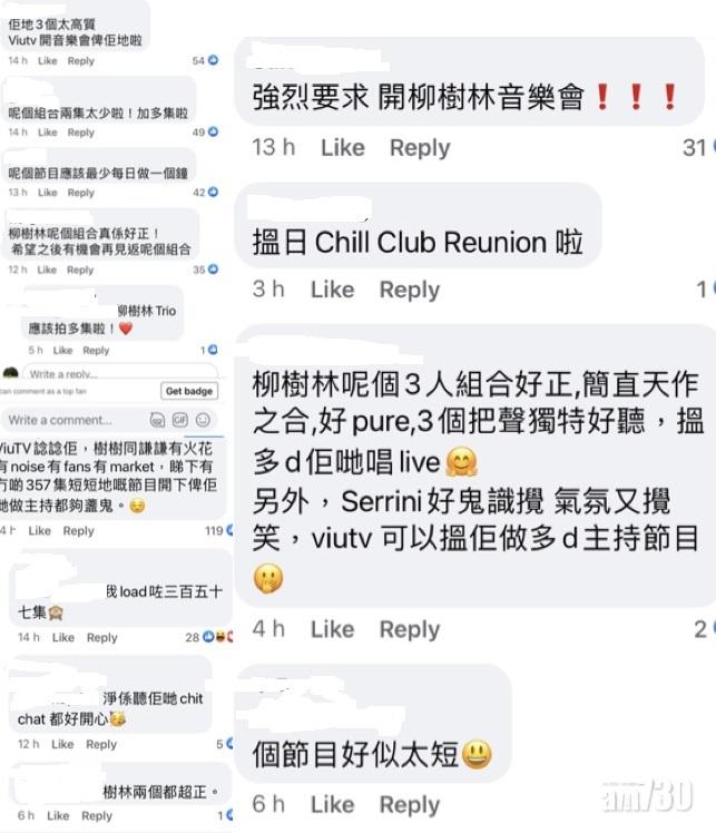 最精彩是3人同場獻唱環節,Jer唱《迴光物語》、Serrini唱《旋轉with me》、林家謙唱《特倫斯夢遊仙境》,重新編曲的「三合一」演繹,讓觀眾大飽耳福,絕對是「不能只得我聽見」之選。兩集節目獲網民大讚超高質又富娛樂性,不少網民嫌兩集(每集半小時)唔夠喉,紛紛要求節目「足本版」,並大讚Serrini為人盞鬼、懂得搞氣氛,建議ViuTV找她主持節目,不少網民希望「柳樹林」再合體演唱,「太高質、天作之合」、「強烈要求開柳樹林音樂」、「搵日Chill Club Reunion」。