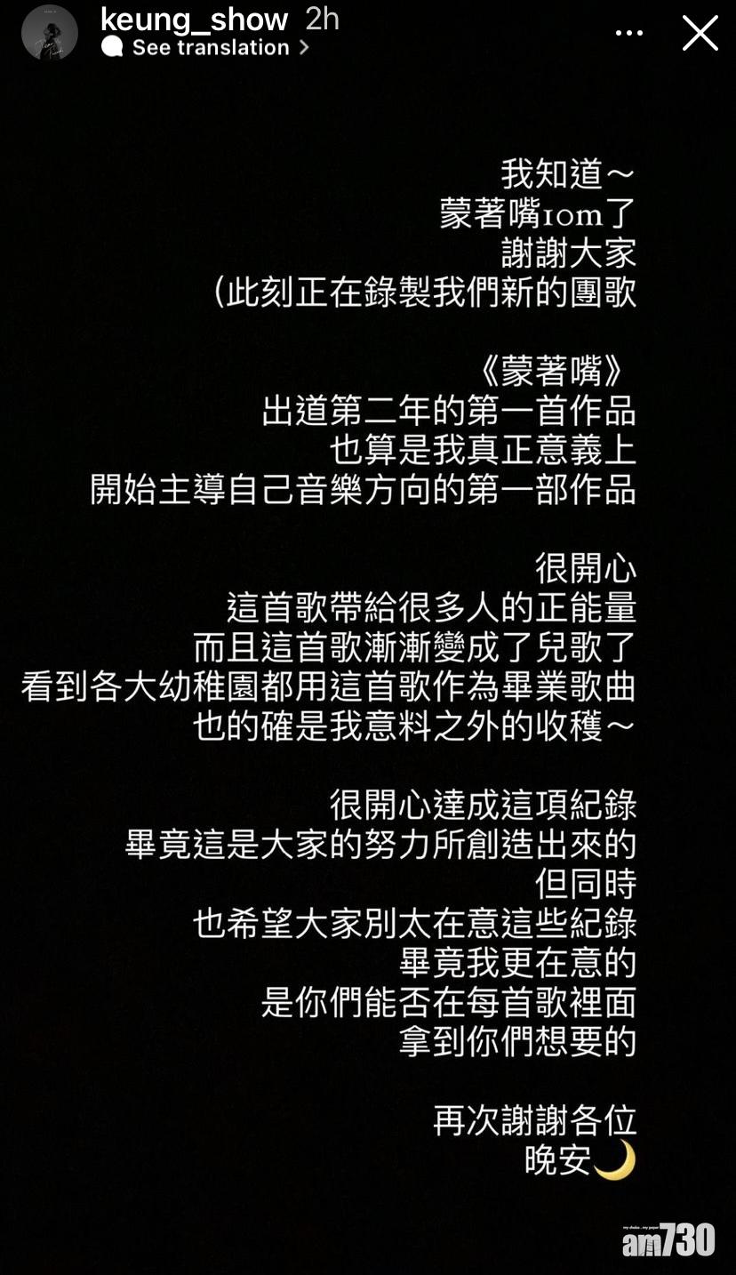 姜濤的《蒙著嘴說愛你》再創佳績,這首唱至街知巷聞的吒叱「我最喜愛的的歌曲」,走勢凌厲,MV已衝破一千萬點擊,非常厲害。正忙於錄唱MIRROR最新團歌的姜濤得知這喜訊後,在今日凌晨時份,在IG的限時動態出po多謝樂迷,他寫道,「《蒙著嘴》是出道第二年的第一首作品,也算是我真正意義上,開始主導自己音樂方向的第一部作品;很開心,這首歌帶給很多人的正能,而且這首歌漸漸成為了兒歌了,看到各大幼稚園都用這首歌作為畢業歌曲,也的確是我意料之外的收穫。」