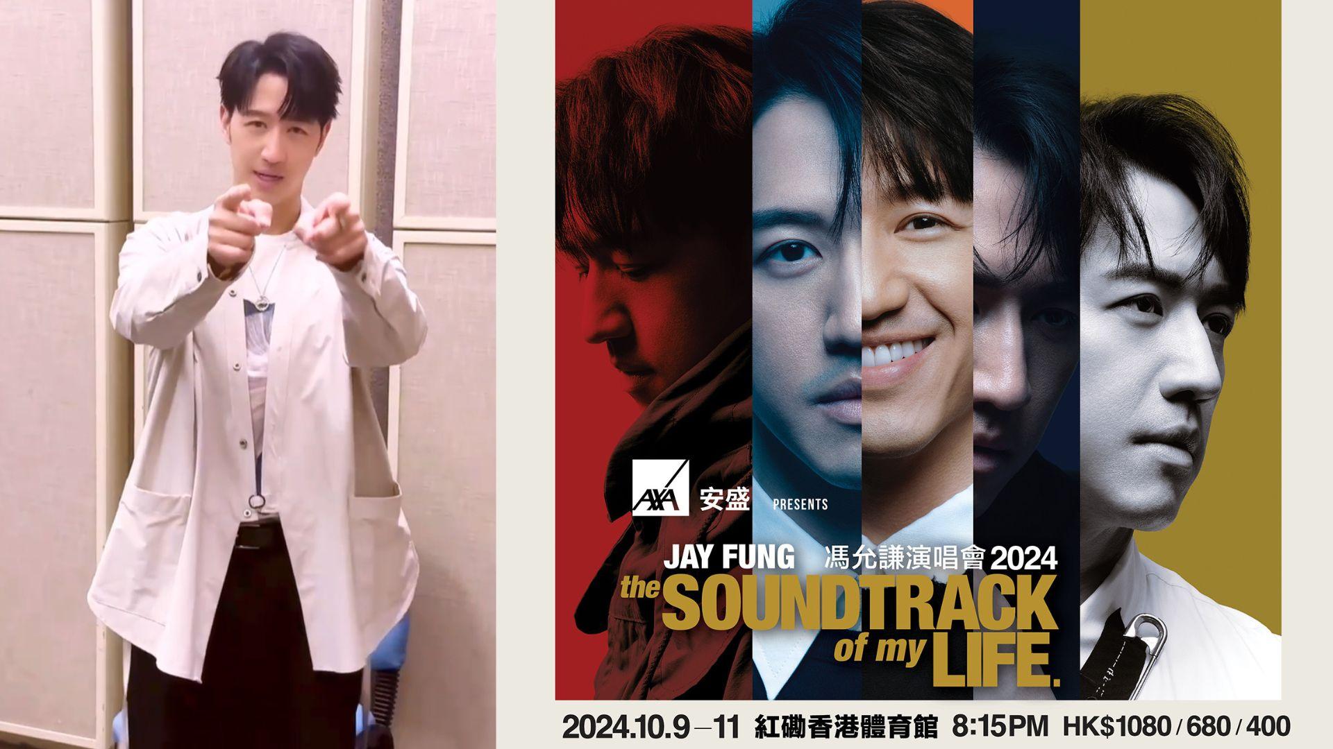 Jay Fung拍片感謝大家對他的支持,並表示:「大家好,我有好正嘅消息同大家分享,就係我第二次紅館演唱會《the SOUNDTRACK of my LIFE馮允謙演唱會2024》優先購票,今日賣晒喇!全靠你哋支持,多謝你哋熱烈反應,我會繼續努力。可能有啲朋友今日買唔到飛唔緊要,我哋仲會有公開發售!10月見!」是次Jay Fung紅館騷票價分$1080、$680、$400三種。