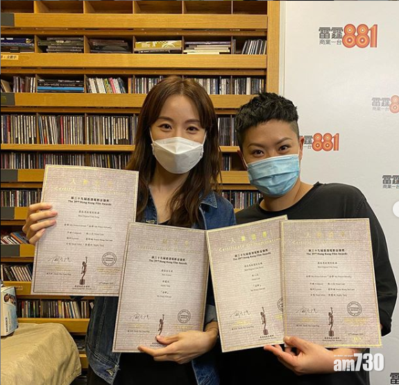 林二汶二汶憑電影《金都》獲今屆金像獎「最佳原創電影音樂」,她與鄧麗欣展示人圍證書。