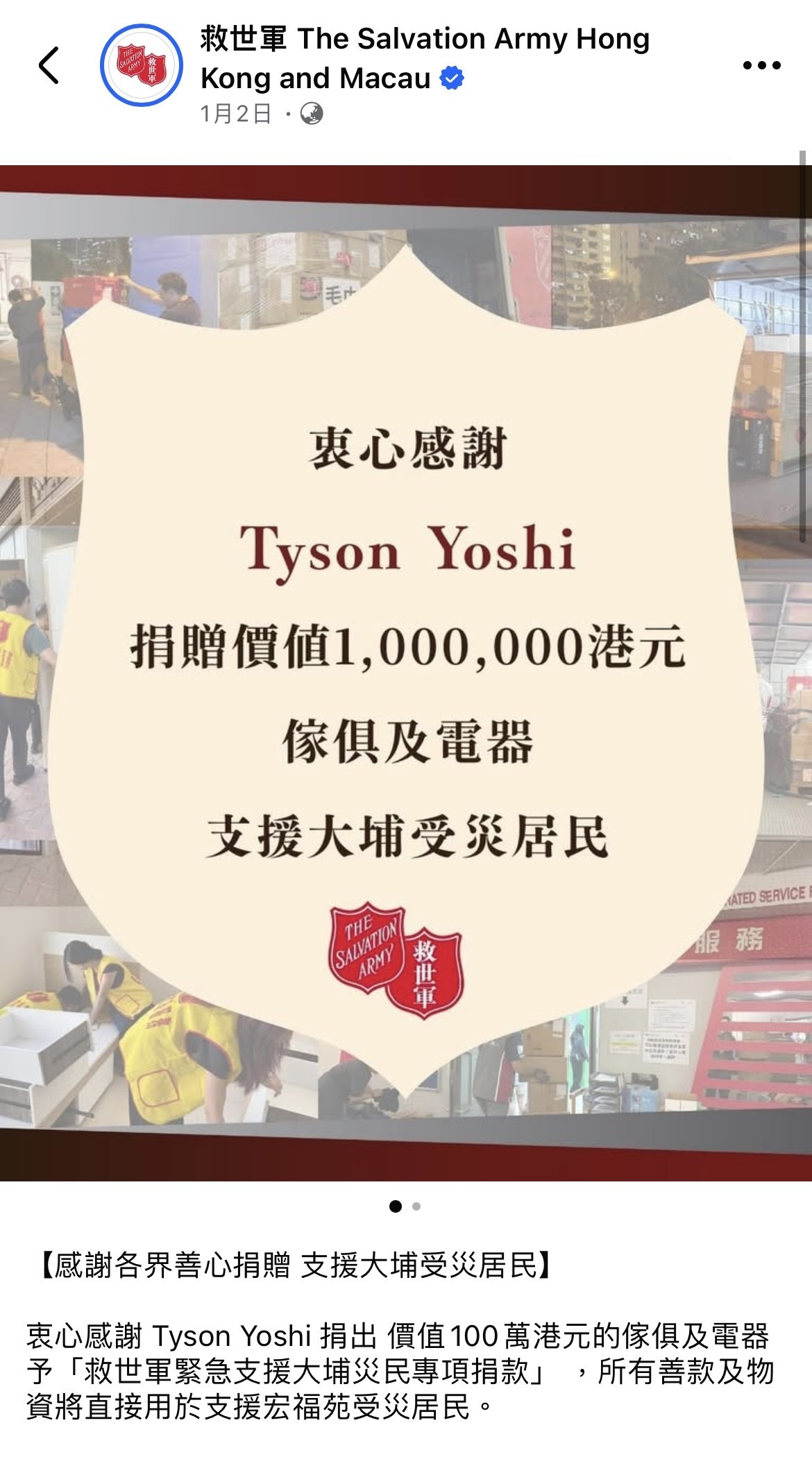 Tyson Yoshi早前捐出100萬傢俬及電器,並經救世軍安排給予災民。