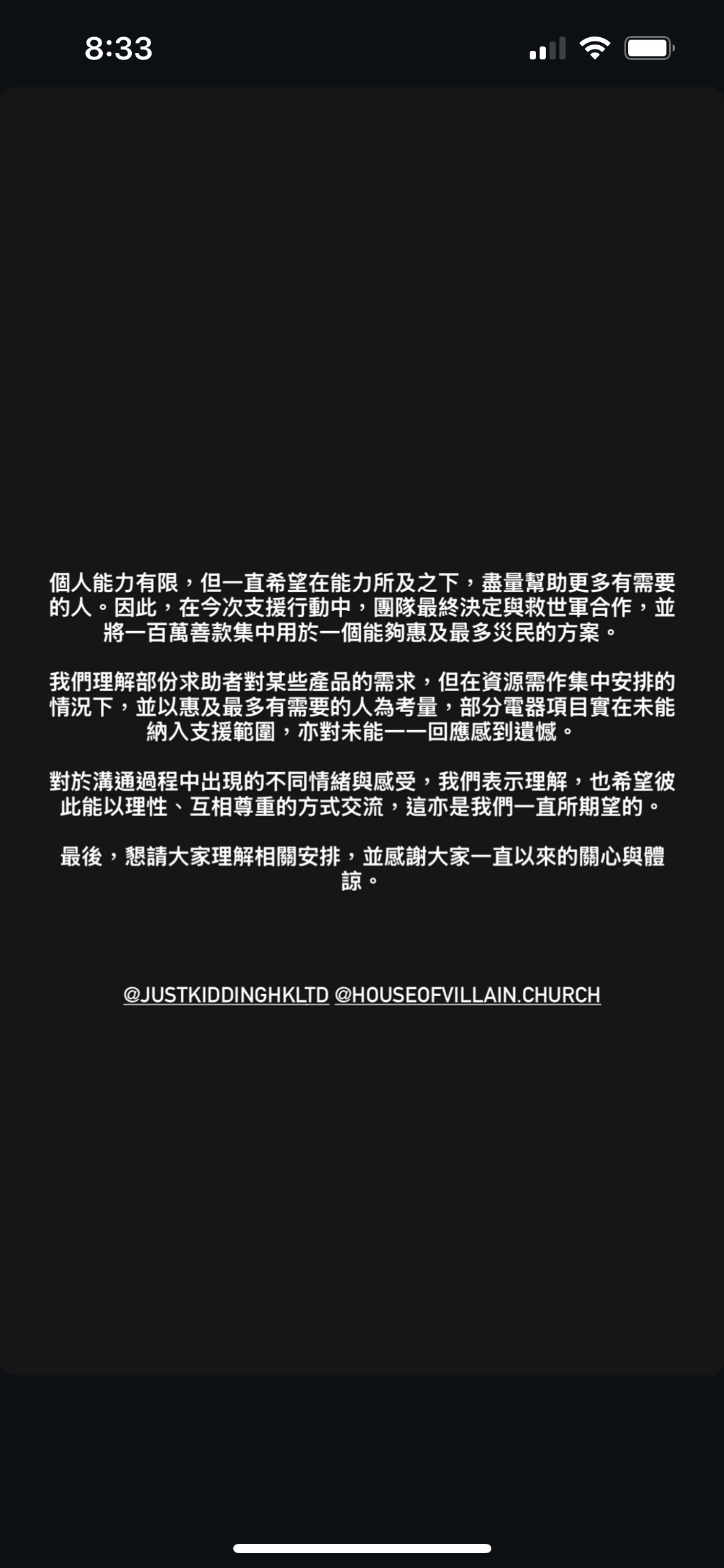 Tyson Yoshi的團隊亦就有關事件發出正式聲明:「個人能力有限,但一直希望在能力所及之下,盡量幫助更多有需要的人。因此,在今次支援行動中,團隊最終決定與救世軍合作,並將一百萬善款集中用於一個能夠惠及最多災民的方案。我們理解部份求助者對某些產品的需求,但在資源需作集中安排的情況下,並以惠及最多有需要的人為考量,部分電器項目實在未能納入支援範圍,亦對未能一一回應感到遺憾。對於溝通過程中出現的不同情緒與感受,我們表示理解,也希望彼此能以理性、互相尊重的方式交流,這亦是我們一直所期望的。最後,懇請大家理解相關安排,並感謝大家一直以來的關心與體諒。」