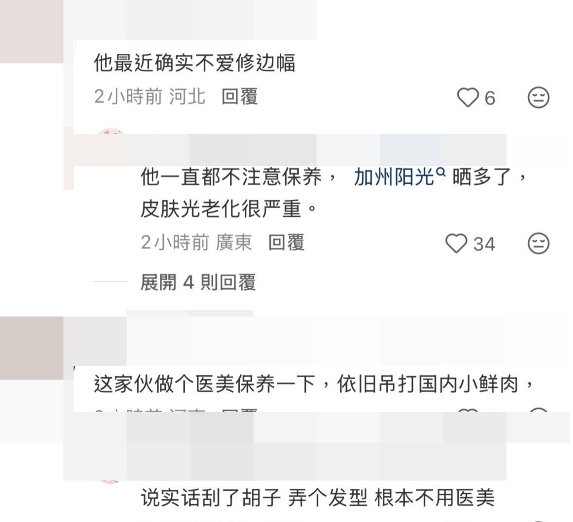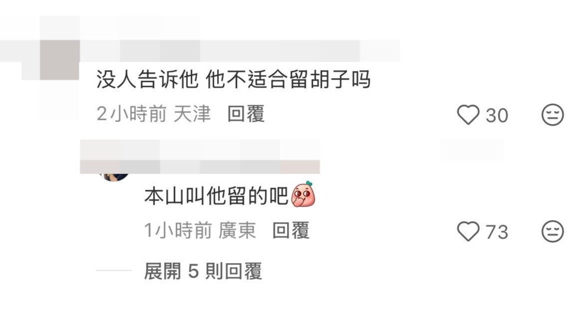 網民留言指Edison不適合留鬍鬚,並寫上:「他一直都不注重保養,陽光曬多了,皮膚老化很嚴重」、「這家伙做個醫美保養一下,能夠勝過內地的小鮮肉」、「沒有人告訴他不適合留鬍鬚吧!」