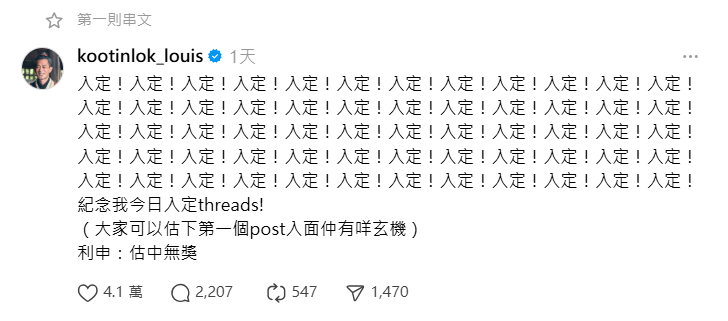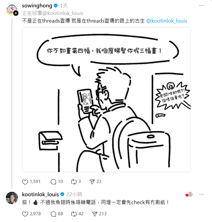 他表示Threads不是由工作團隊管理,是由他親自出po,並稱自己專登打「魚翅」取代「如廁」,但沒想到大家誤以為是語音輸入。他表示一直都有回覆網民的習慣,自己覺得不太花時間,在旁的宣萱表示自己就要快很多時間在Threads上,更表示非常不滿古天樂一開po就已經有這麼多fans,而自己卻用不少時間去累積fans。