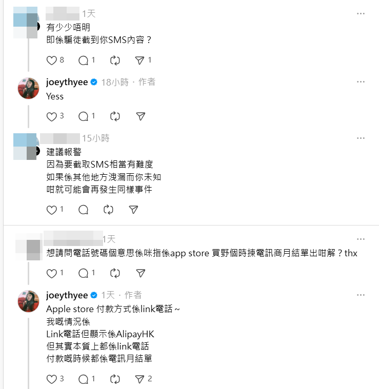 經過今次事件之後,她亦教大家做多步,防止被騙徒有機可乘。她說︰「而家好多人都係用電話號碼連接Account,咁啲騙徒唔知點解好容易就拎到個電話號碼,連接到付款message,就可以用你Account洗錢。只要你喺Apple Store度改返唔好拎電話號碼付款,最好用返信用卡等方式,就唔會有呢個問題,覺得好需要話俾大家知。同埋大家如果見到288嘅收費,記得了解清楚係咪你本人用。」