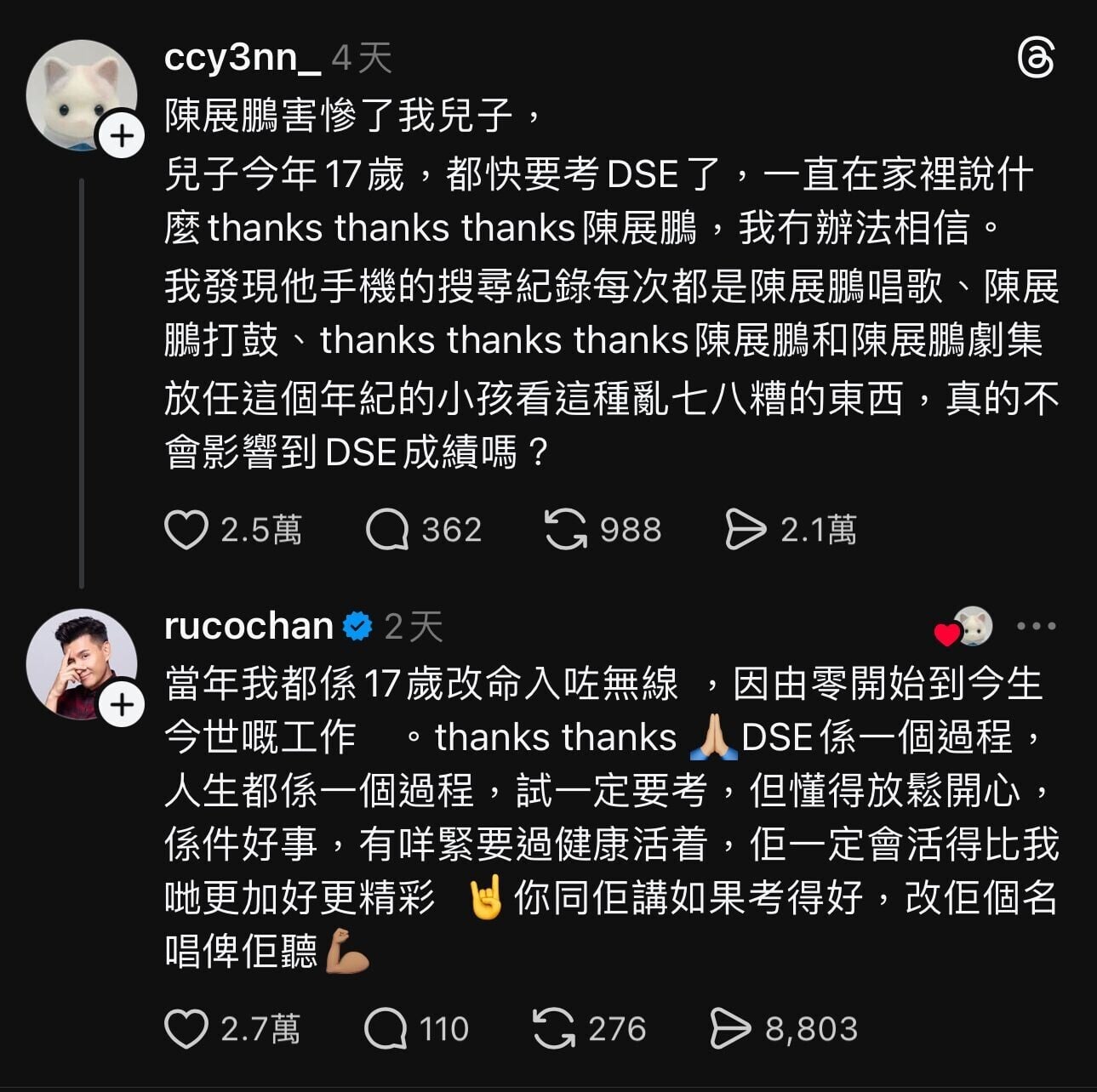 日前,有網民在Threads分享「陳展鵬害慘了我兒子」膠文,提到他當年演唱《Monica》的經典搞笑片段,當中寫道:「陳展鵬害慘了我兒子,兒子今年17歲,都快要考DSE了,一直在家裡說什麼thanks thanks thanks陳展鵬,我冇辦法相信。我發現他手機的搜尋紀錄每次都是陳展鵬唱歌、陳展鵬打鼓、thanks thanks thanks陳展鵬和陳展鵬劇集,放任這個年紀的小孩看這種亂七八糟的東西,真的不會影響到DSE成績嗎?」帖文連日來引起網民關注,「煎pan」亦有驚喜回應,陳展鵬更認真留言:「當年我都係17歲改命入咗無線,因由零開始到今生今世嘅工作。thanks thanks,DSE係一個過程,人生都係一個過程,試一定要考,但懂得放鬆開心,係件好事,有咩緊要過健康活着,佢一定會活得比我哋更加好更精彩。你同佢講如果考得好,改佢個名唱俾佢聽。」