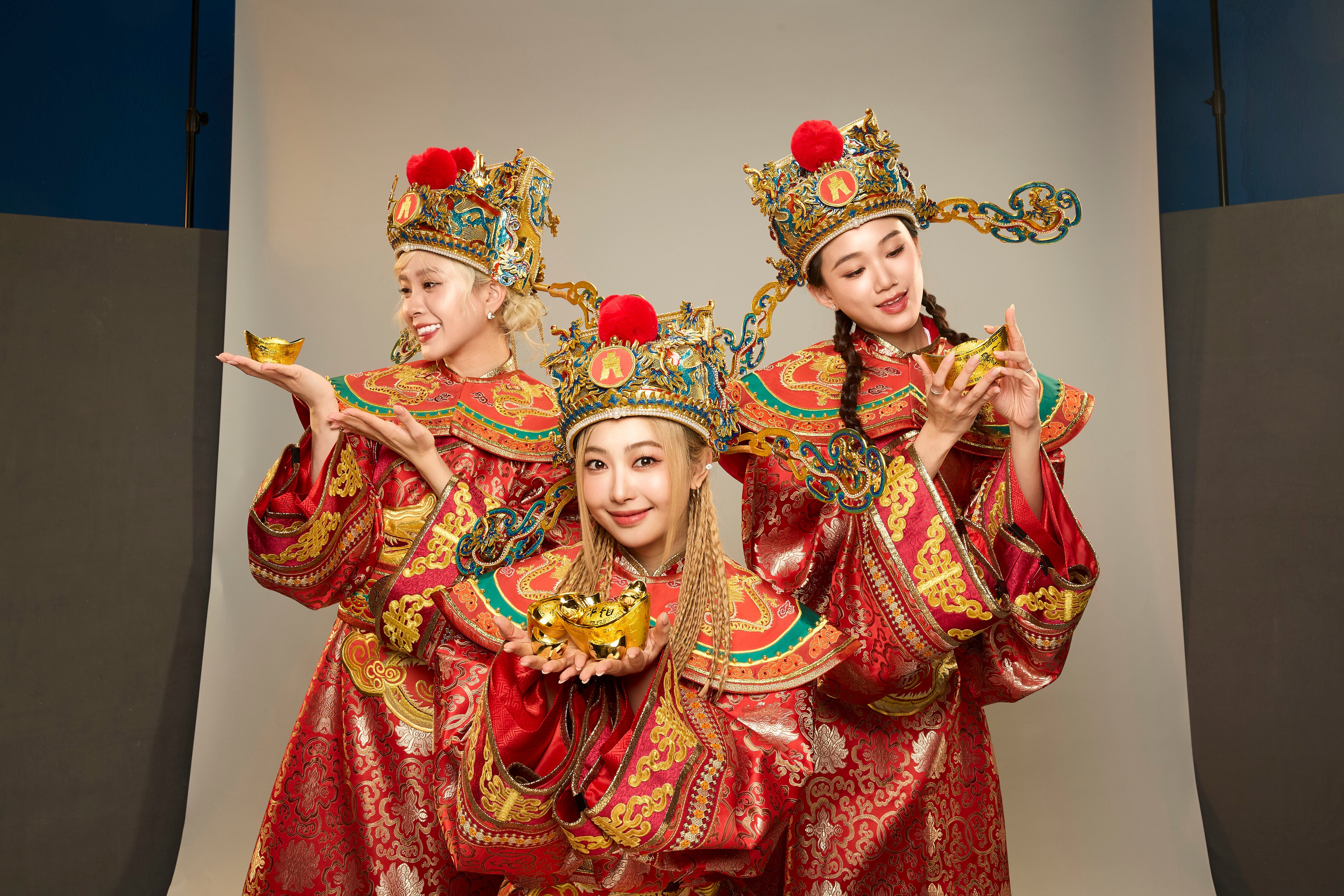 女團VIVA成員姜咏鑫(Ada)、李晞彤(Carina)、張鈊貽(VALC)青春無敵,即使換上厚重華麗的財神造型,依然活力爆燈!