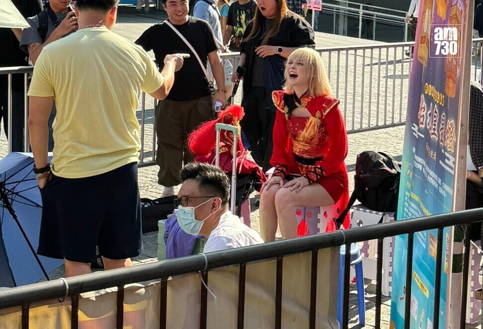 ViuTV藝人徐㴓喬現身嗇色園黃大仙祠「擔櫈仔」排隊等爭上頭炷香。 (娛樂組攝)