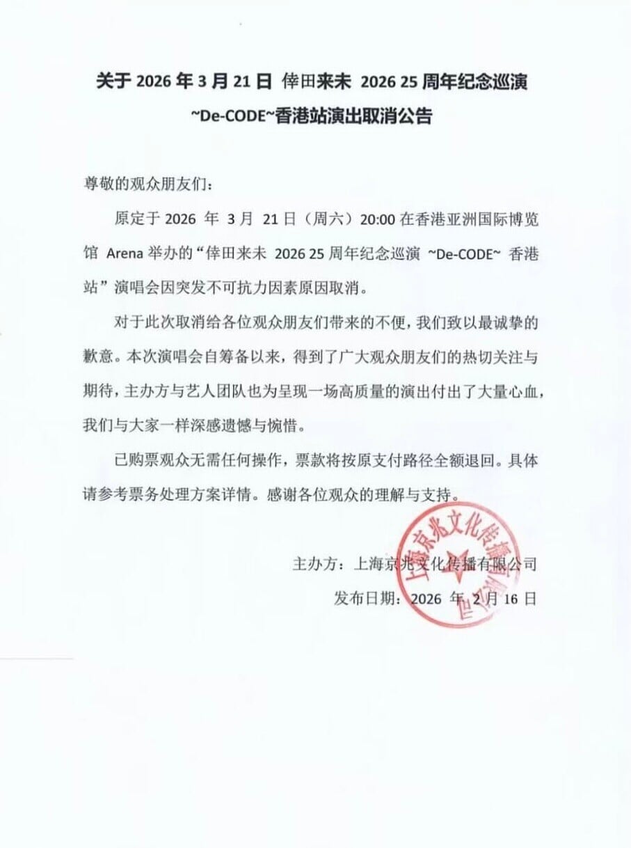 日本歌姬倖田來未上月底宣布首次舉行香港個唱,然而原定於3月21日假亞洲國際博覽館Arena的「KODA KUMI 25th ANNIVERSARY TOUR 2026~De-CODE~ in Hong Kong」演唱會,主辦單位上海京兆文化傳播有限公司於昨日(16日)以簡體字發布公告,決定該場演出因突發不可抗力因素取消!