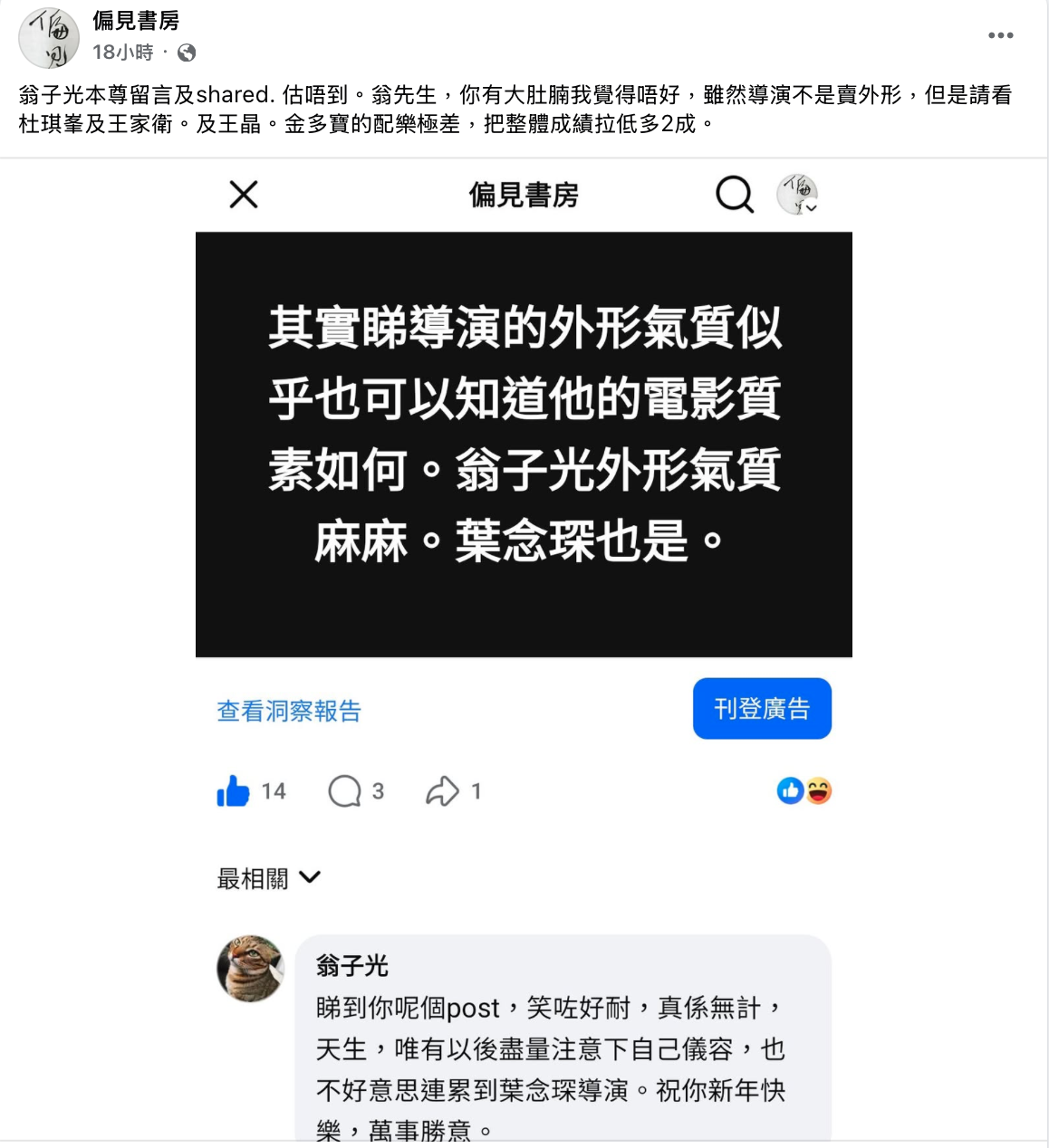至於有網頁批評翁子光的外型,就令不太活躍社交平台的本尊現身留言說:「睇到你呢個post,笑咗好耐,真係無計,天生,唯有以後盡量注意下自己儀容,也不好意思連累到葉念琛導演。祝你新年快樂,萬事勝意。」其後專頁再回應說:「翁先生,你有大肚腩我覺得唔好,雖然導演不是賣外形,但是請看杜琪峯及王家衛。及王晶。金多寶的配樂極差,把整體成績拉低多2成。」