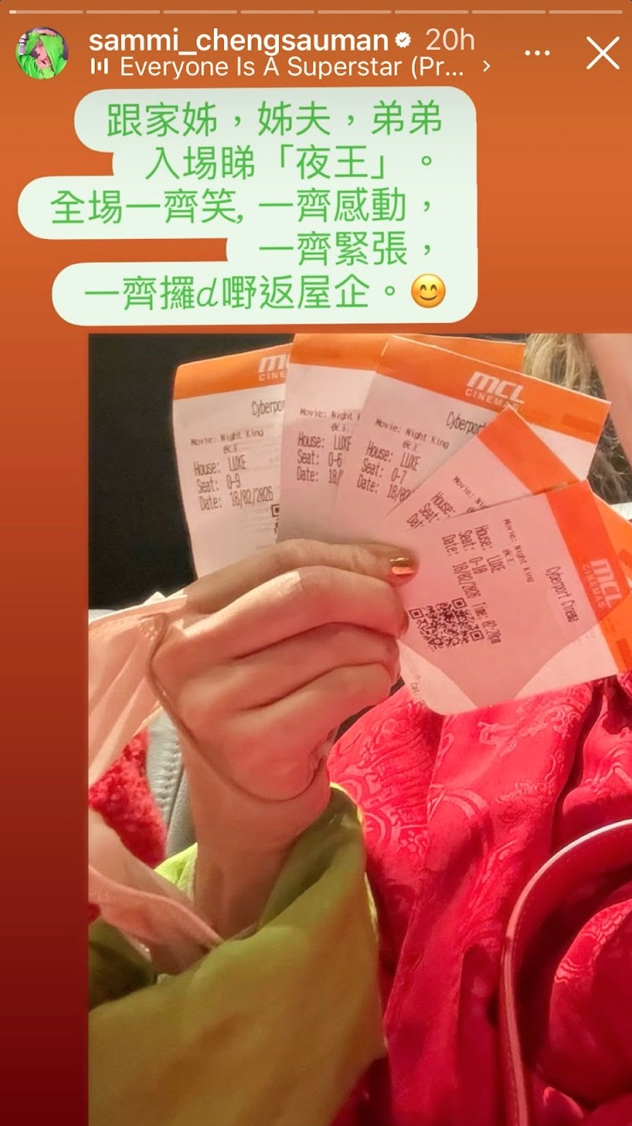 Sammi過年前馬不停蹄完成一連串宣傳後,趁新年假期跟家人一齊入戲院捧V姐(Sammi飾)場,笑住迎馬!在社交平台分享跟家姐,姊夫,弟弟入埸睇《夜王》,全場一齊笑,一齊感動,一齊緊張,一齊攞啲嘢返屋企。Sammi並稱:「由開拍到前陣子瘋狂式緊密宣傳工作,一切一切記憶猶在。一步一腳印。點滴在心頭。歡哥V姐跟東日的仝人(包括太子峰)衷心多謝每一位的入埸。這部電影是我們的共同結晶品。才公映兩天,路仍漫長,繼續一步一腳印。」