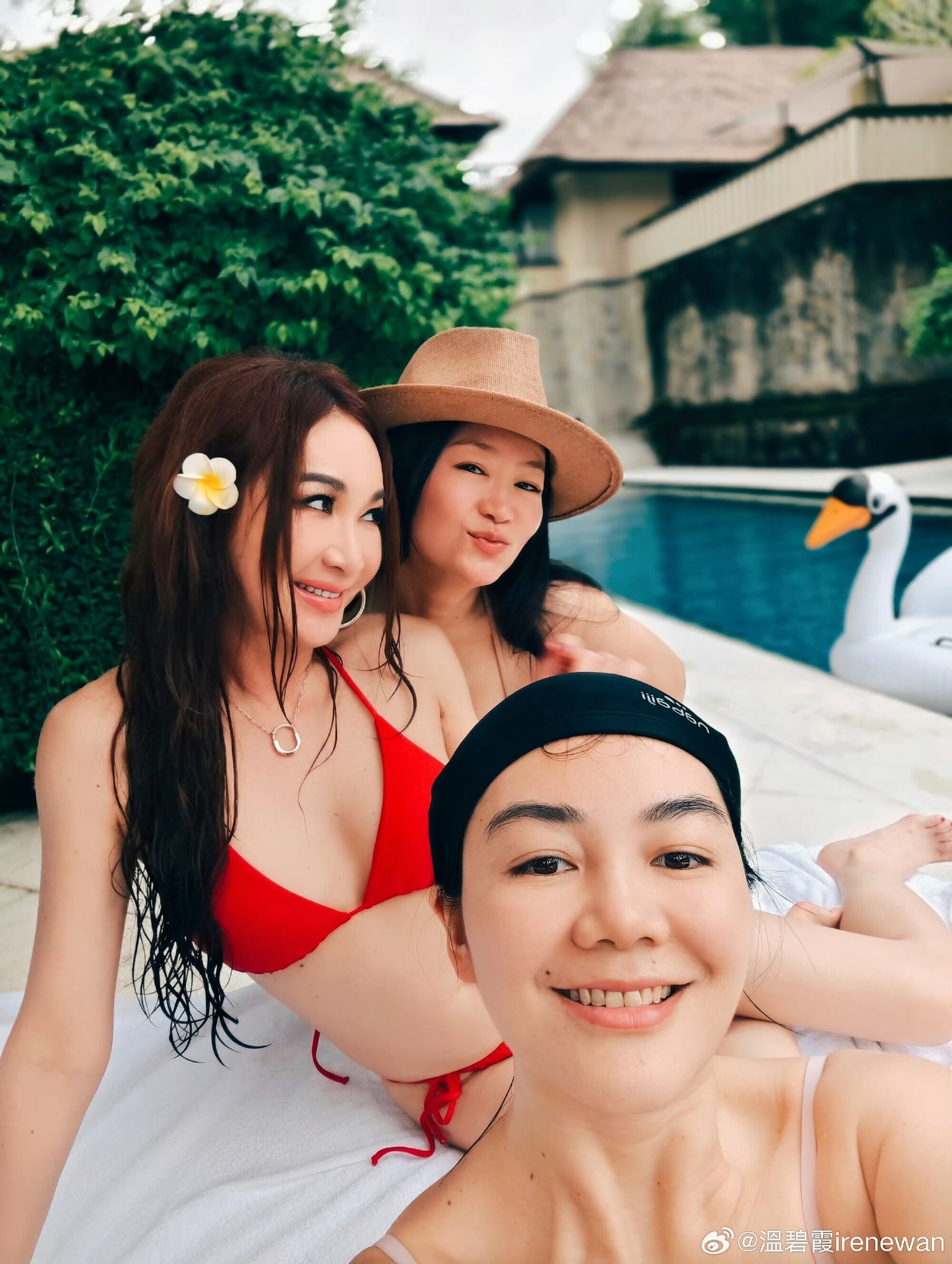 溫碧霞飛峇里晒紅色三點式泳衣賀新年。