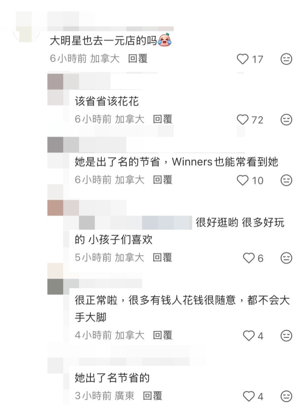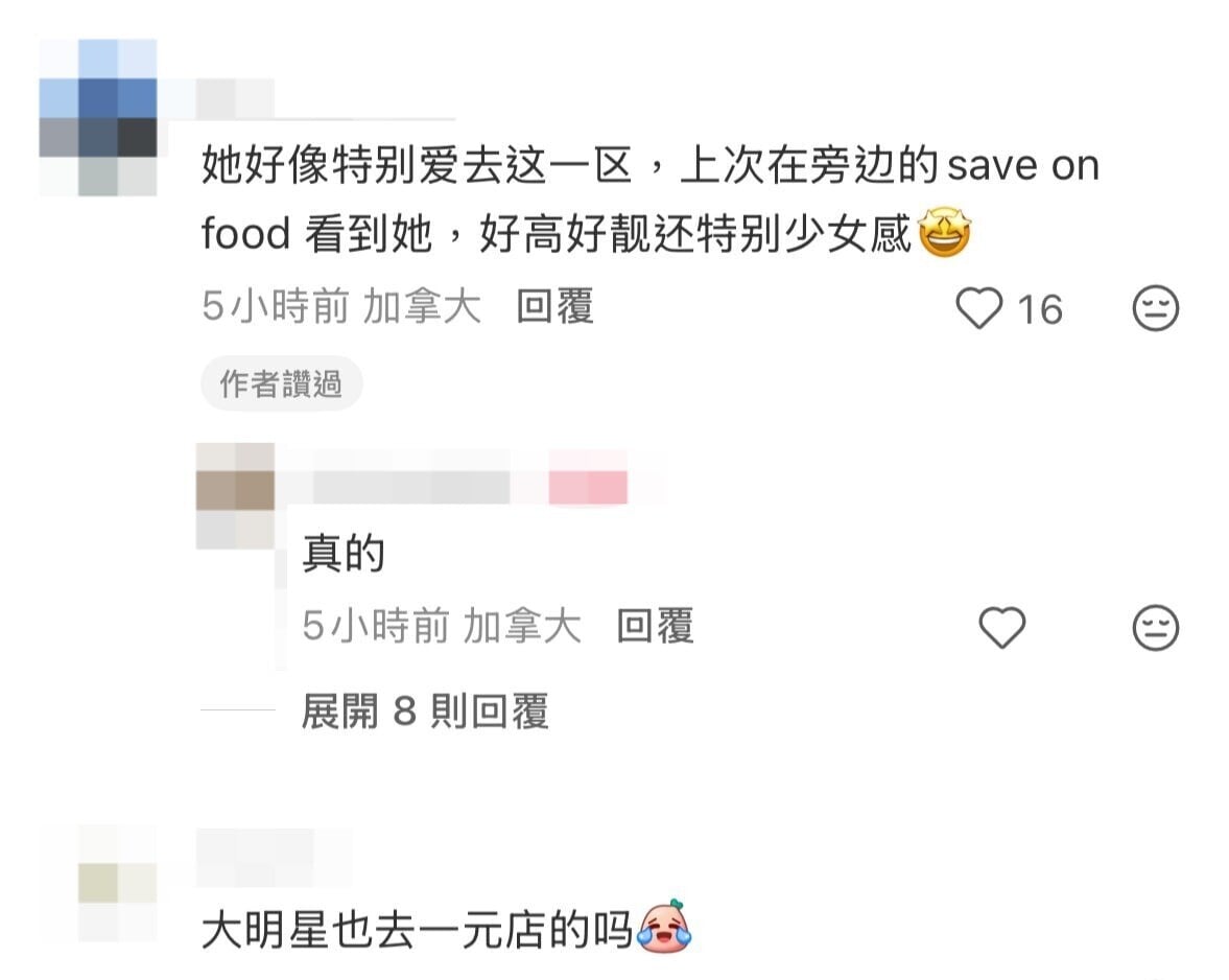 當天Linda素顏上陣,隱約看到她的五官輪廓,皮膚狀態極佳,她身穿羽絨配搭平底鞋示人,打扮得相當樸素低調。有網民分享Linda向店員查詢是否有販售泡泡糖,指她非常有情懷。另外有網民留言表示:「大明星也去一元店的嗎」、「她出名慳家」、「她好像特別愛去這一區,上次在旁邊的Save-On-Foods看到她,好高好靚還特別少女感!」
