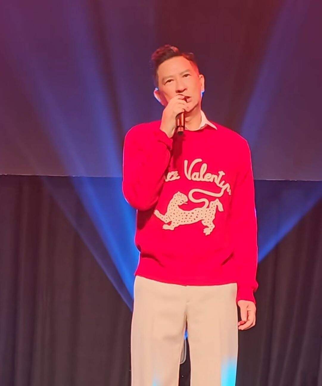 張家輝最近獲邀請去新加坡登台唱歌,他在晚宴上獻唱張學友經典金曲《吻別》大展歌喉。當天張家輝身穿紅色衫上台非常符合賀年氣氛,期間他穿梭在觀眾席一邊唱歌一邊握手,現場觀眾歡呼尖叫,瞬間變粉絲見面會。張家輝發揮搞笑本色呼籲現場賓客們放下美食,盡情投入欣賞表演。