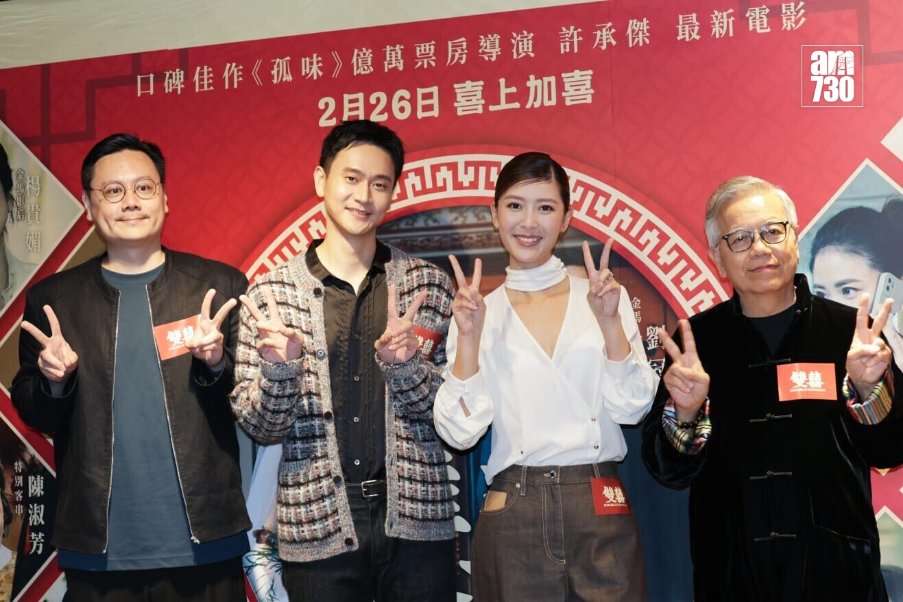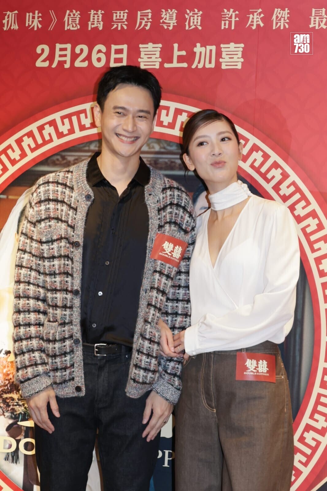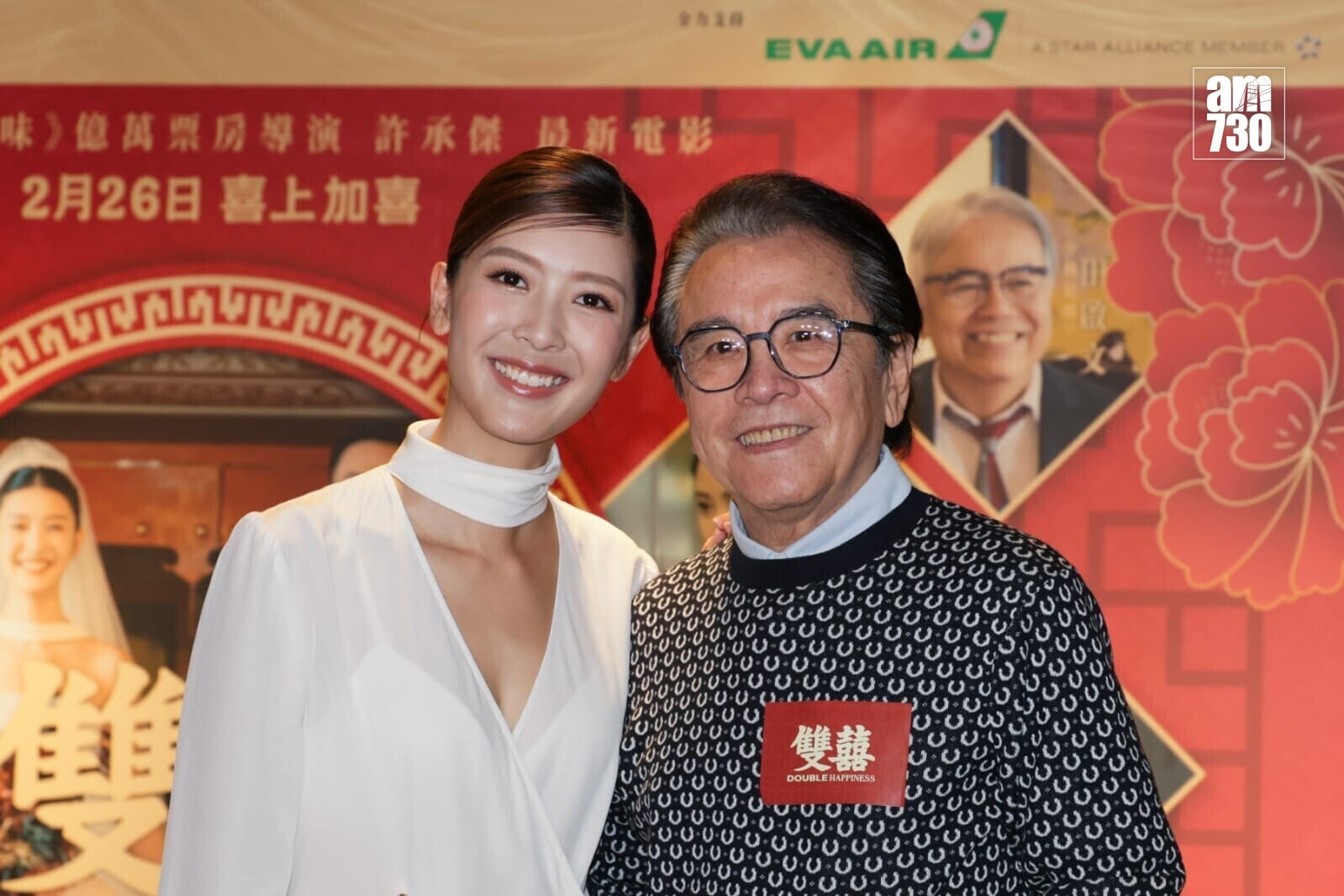 台灣賀歲喜劇《雙囍》今日(24日)於香港舉行首映禮,3位主角余香凝、劉冠廷和田啟文,聯同導演許承傑、監製苗華川和張林翰齊齊現身。劉冠廷與余香凝在戲中合演新婚夫妻,他大讚新娘子漂亮,笑言當得知田啟文演外父時,懷疑余香凝是領養的女兒,田啟文(田雞)聞言即反駁,「通常女兒似爸爸!所以可讓我老婆放心,雖然我們不打算生,但妳睇,生出來的女兒不止漂亮,更是影后,生得過呀!」余香凝亦大表認同:「個樣似爸爸,但身高可能似媽咪,田生都好靚仔。」