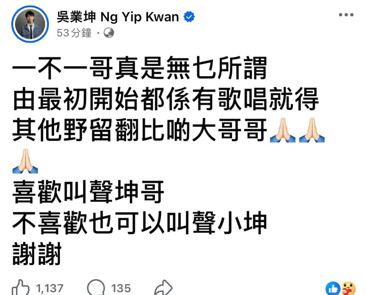 坤哥今日(26日)在社交平台發文大方回應無緣做一哥,他寫上:「一不一哥真是無乜所謂,由最初開始都係有歌唱就得。其他野留翻比啲大哥哥,喜歡叫聲坤哥,不喜歡也可以叫聲小坤,謝謝!」