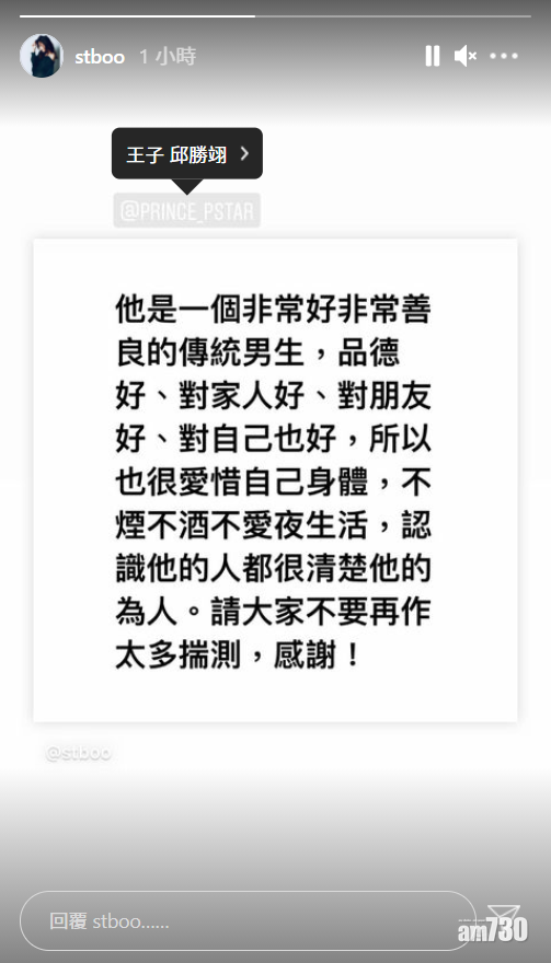 王子所屬的公司回應傳媒查詢道︰「王子邱勝翊不菸不酒不夜店,一直是自我要求高標準的演藝人員,沒有所謂女性友人介入。內容與事實不符,勿再浪費媒體資源。」其後Stephy亦在社交平台發文道︰「他是一個非常好非常善良的傳統男生,品德好、對家人好、對朋友好、對自己也好,所以也很愛惜自己身體,不煙不酒不愛夜生活,認識他的人都很清楚他的為人。請大家不要再作太多揣測,感謝。」雖然Stephy沒指明道姓,但很明顯這個「他」便是指前度王子。