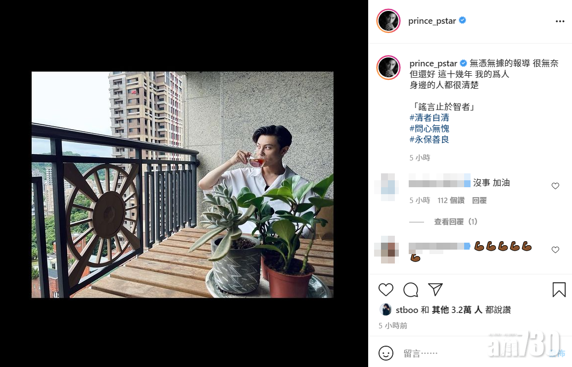 鄧麗欣(Stephy)與台灣男星邱勝翊(王子)於上月底宣布結束長達3年的姊弟戀。未幾有報道指王子是花心男,愛蒲夜店,甚至指他與造型師搭上,令Stephy決定斬纜。然而,王子今日在社交平台發文否認︰「無憑無據的報道 很無奈 但還好 這十幾年 我的爲人 身邊的人都很清楚 『謠言止於智者』 清者自清 問心無愧 永保善良。」
