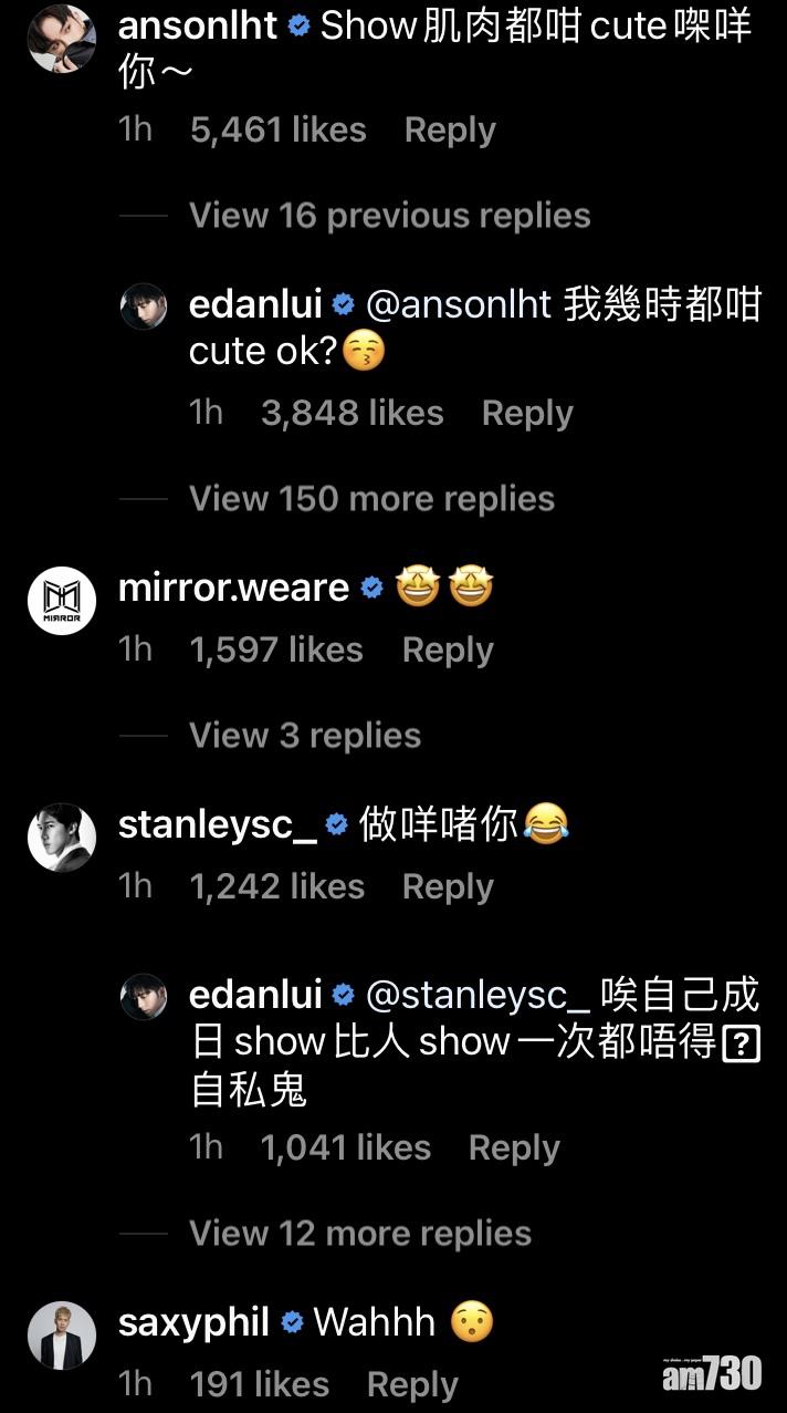 ViuTV劇集《大叔的愛》掀起久違了的追劇熱潮,戲中演員知名度大增,兩位演阿田與阿牧的MIRROR成員Edan(呂爵安)和Anson Lo(盧瀚霆),昨午「情侶檔」出巡更是迫爆商場,當晚兩人分別在社交平台的限時動態多謝「神徒」和「爵屎」(粉絲暱稱)撐場,Edan更騷肌大派福利,向來鬼馬的他更附送「P圖教學」,示範如何「有啲料到」地曬肌。Edan出po後,「男朋友」Anson Lo火速留言,「Show 肌都咁cute㗎咩你~」兩人公開打情罵俏,真係sweet sweet。不得不提,「教主」Anson Lo亦在社交平台分享主唱片尾曲《不可愛教主》的心聲,並預告今晚10時開Live,「神徒」要坐定定了。