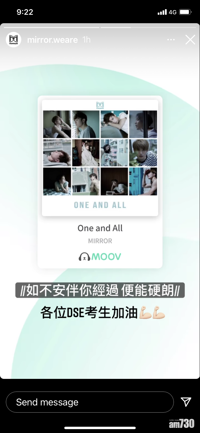 MIRROR 在IG Story的官方IG 以《One And All》勉勵考生:「如不安伴你經過,便能硬朗;各位DSE考生加油。」