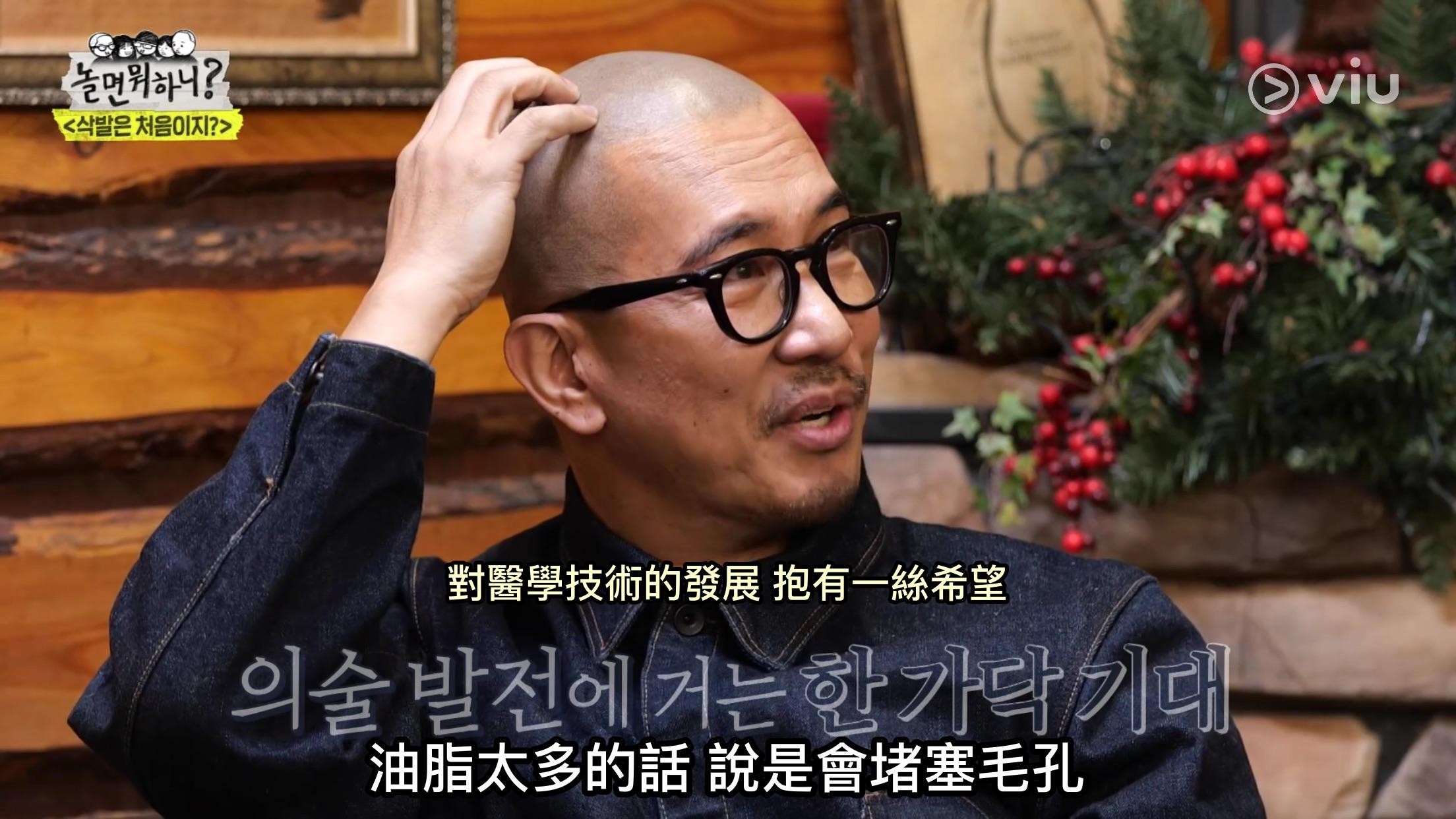他坦言並不是為了領先潮流而剃頭:「從1990年開始,至今維持(光頭造型)30年了。從25歲開始便有(脫髮)徵兆,那時候我就開始用一點點黑彩噴霧。」節目更公開了他年輕時的照片,清秀樣貌令全場人士大吃一驚!主持人HaHa還大讚似足張國榮:「哥那時候頭髮很多,是張國榮的髮型!好帥啊,根本是美少年!」