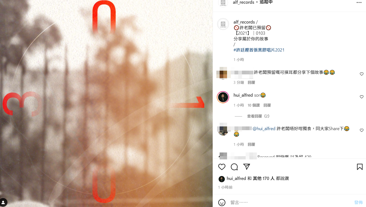 許廷鏗首張黑膠唱片將於月底開賣,他表示今次只會推出1231張,而為了呼應返新碟《2021》,入面將有366隻特別版會用遊戲方式供歌迷搶購。今日他的公司「自許紀錄」出PO表示要搶得自己心儀號碼的黑膠碟,便要寫下「點解會想買到呢個數字」,而帖文獲得最多like者便會收到確認留言,而其中有20個編號是不能預購,「人生第一次出黑膠都只係有良心地留起20隻,即係有超過9成半嘅貨都留返俾大家買㗎,所以有20個編碼係無得預購,caption會寫明留起咗,但你地想照留言都可以,可能感動到老闆讓俾你呢。」