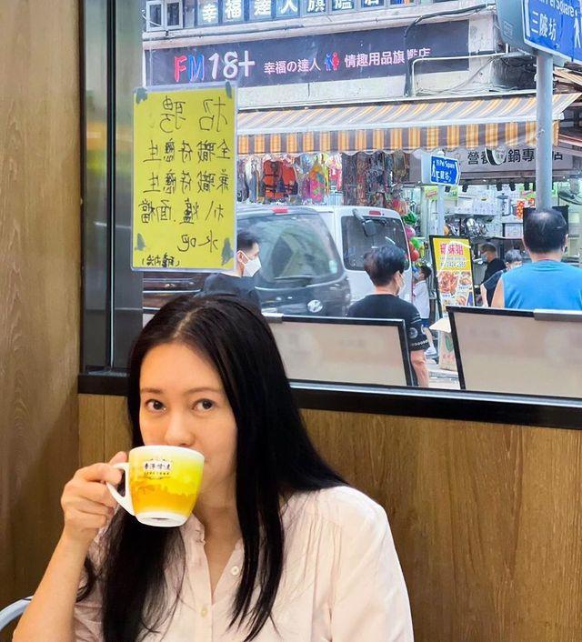 李麗珍在茶餐廳留影,後面的性商店標語卻相當搶FO。
