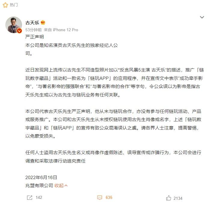 古天樂隨即發聲明,否認與對方合作。翻查資料,該公司的程式與區塊鏈有關。聲明指古天樂從未跟對方合作,也沒有參加該程式的活動、產品或服務推廣,並指從未授權對方使用古天樂的肖像或名字,為免公眾混淆,呼籲各界人士注意,提高警惕,以免蒙受損失。